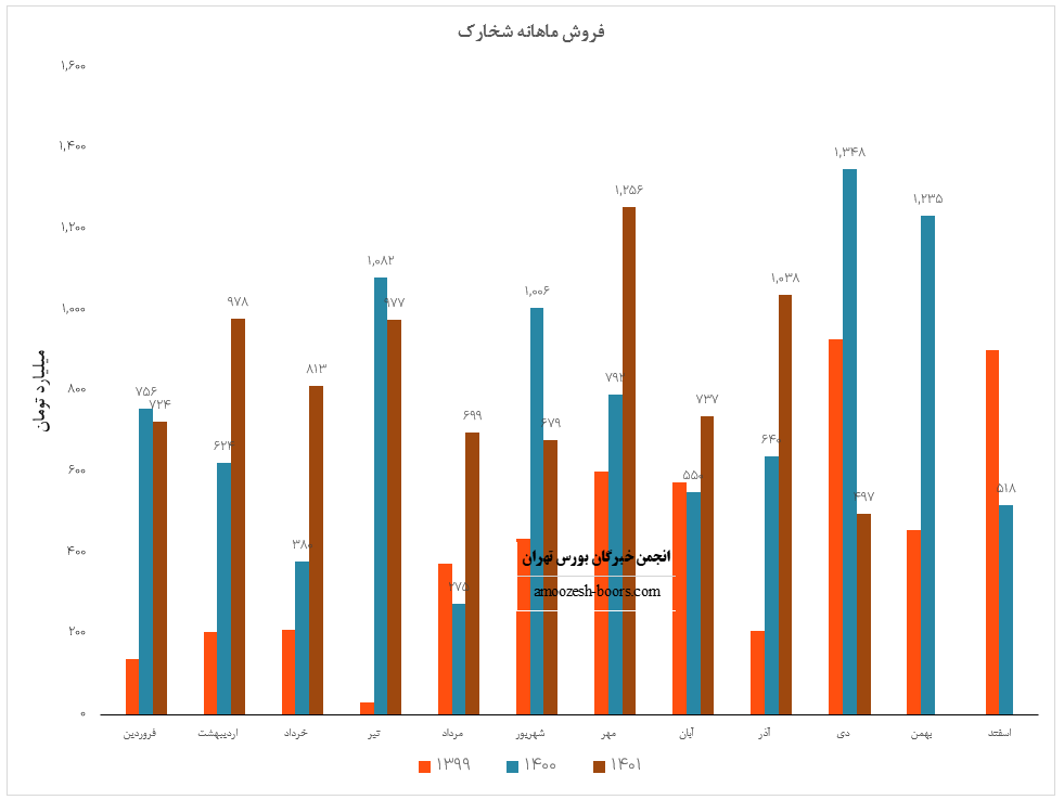 نماد شخارک با افت 33 درصدی نسبت به ماه قبل درآمد 1126.4 میلیارد تومان را گزارش نموده است، این درآمد نسبت به متوسط ماهانه 23% و نسبت به مدت مشابه 117% بیشتر است، تمام درآمد اسفند ماه سال 1401 نماد شخارک از طریق صادرات تامین گردیده است، پر فروش ترین محصول شرکت پتروشیمی خارک مربوط به متانول صادراتی است که با وجود افزایش نرخ 35 درصدی نسبت به ماه قبل 26% کاهش در مقدار فروش را داشته است، مجموع عملکرد 12 ماهه شرکت پتروشیمی خارک 22% نسبت به کل درآمد سال قبل بیشتر گزارش شده است.