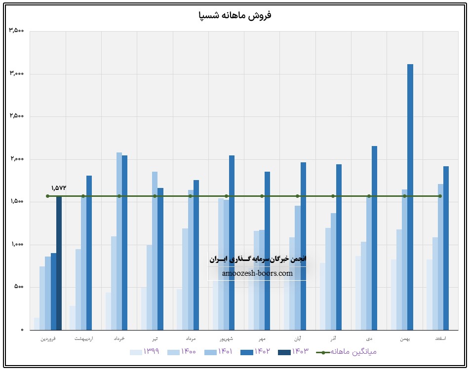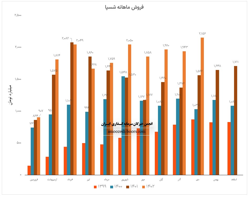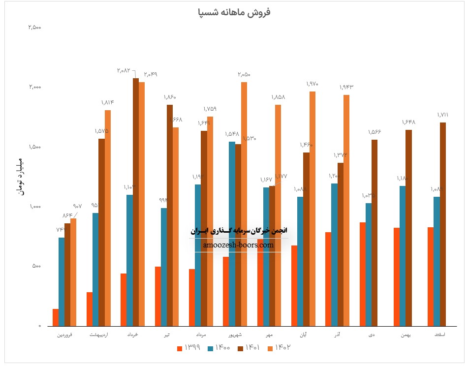 فروش شسپا در این ماه کاهش 38% در مقایسه با ماه گذشته داشته است، همچنین در مقایسه به مدت مشابه 12% افزایش و نسبت به متوسط ماهانه 1% کاهش داشته است.