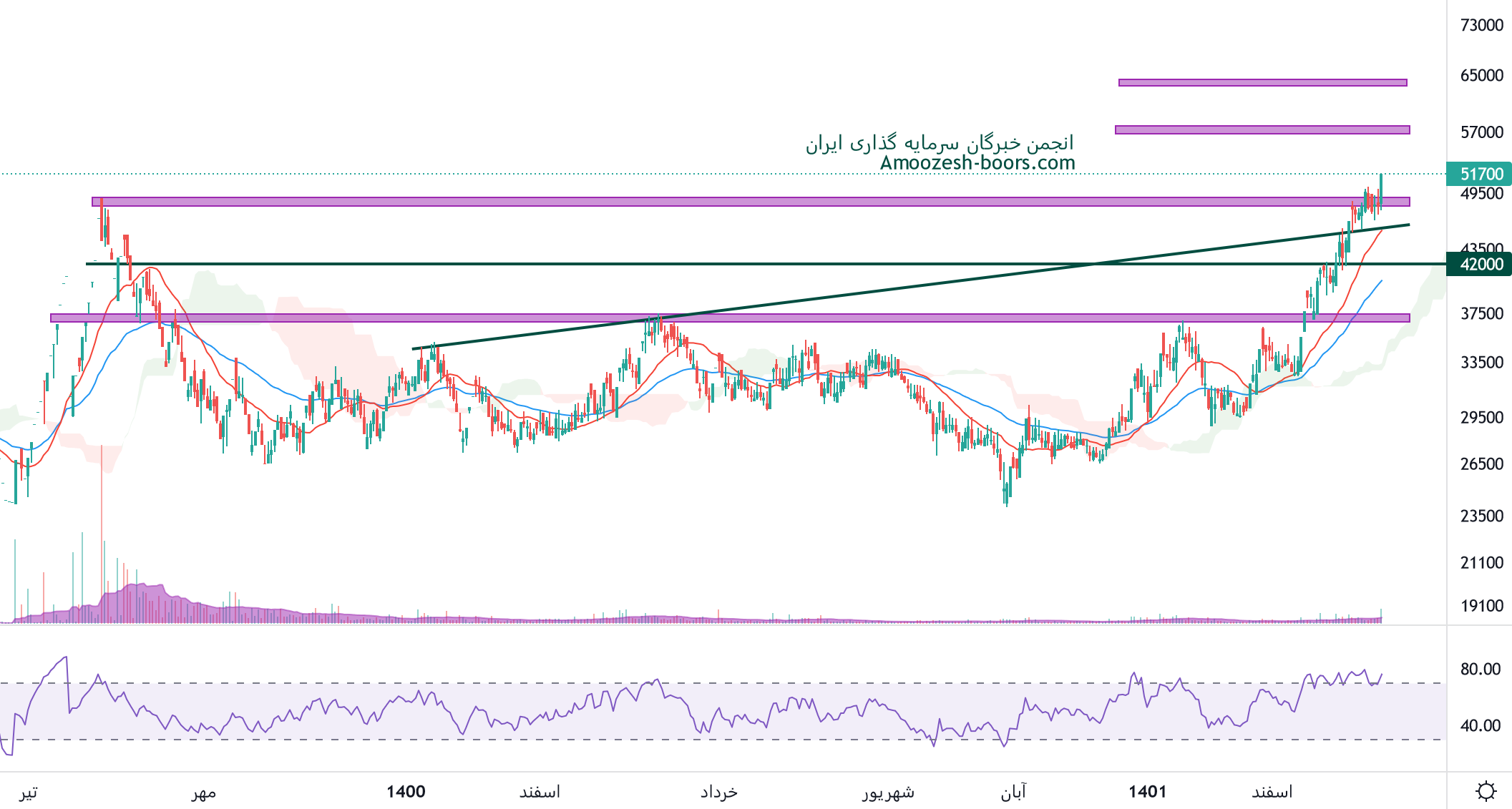 بر اساس نمودار نماد شصدف شاهد این هستیم که قیمت در اینتر مدیت صعودی قرار داشته و با فشار خریدارن موفق به شکست سقف کانال سایدوی خود گردیده است، با توجه به شکست قله تاریخی سهم شصدف به سهامداران پیشنهاد نگهداری داده میشود و میتوانند حد ضرر خود را تا مقاومت شکسته شده جا به جا نمایند، همچنین در صورت تثبیت قیمت در ناحیه 51000 ریال سیگنال ورود پله ای نماد شصدف صادر میگردد.