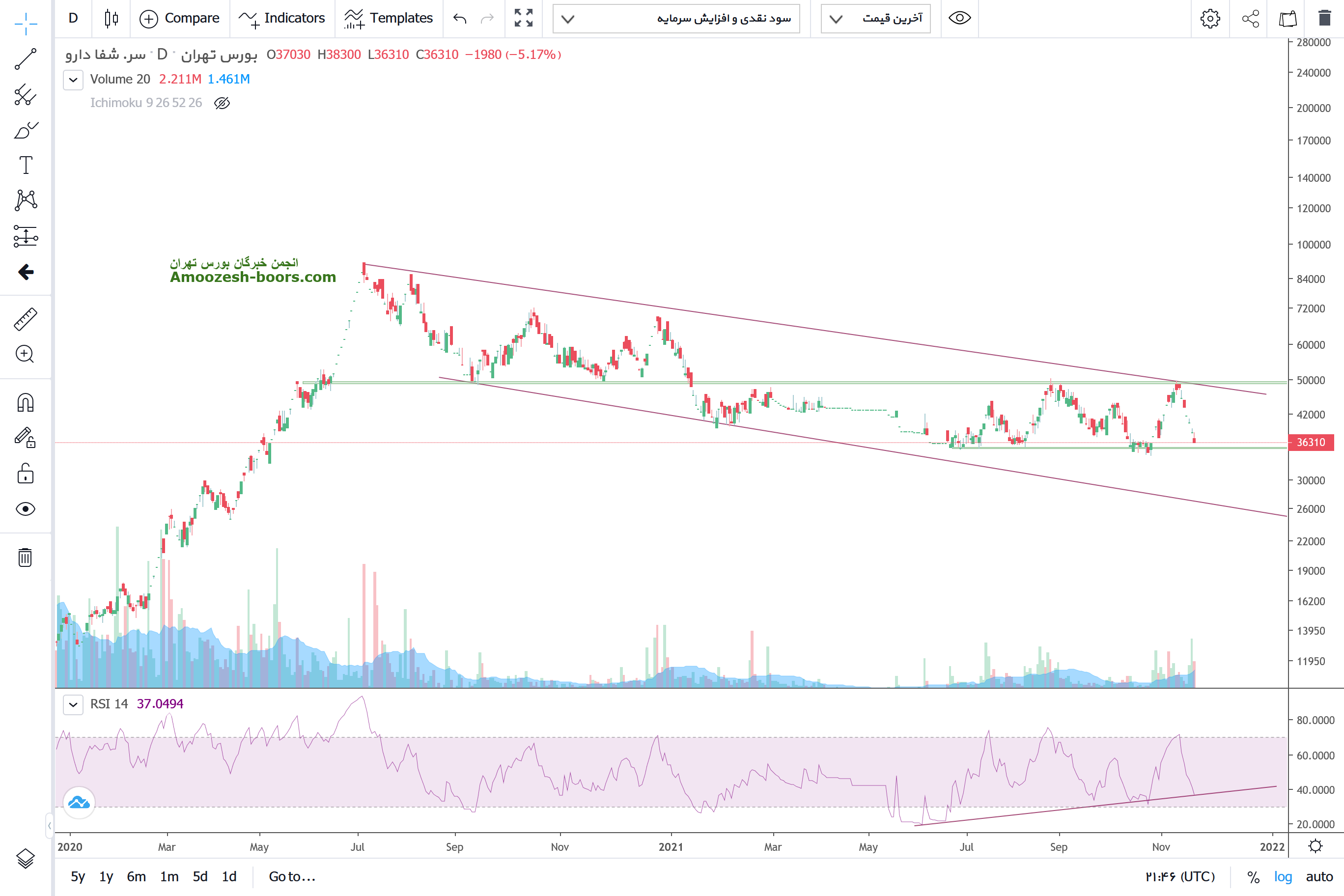 سهم شفا پس از شکست کانال نزولی درگیر مقاومت استاتیک 50000 گردیده است تا زمانیکه حمایت سقف کانال حفظ شود حرکت اصلاحی به مثابه پولبک بوده و میتوان هدف 70000 را محتمل دانست.حمایت سهم 45000 میباشد .