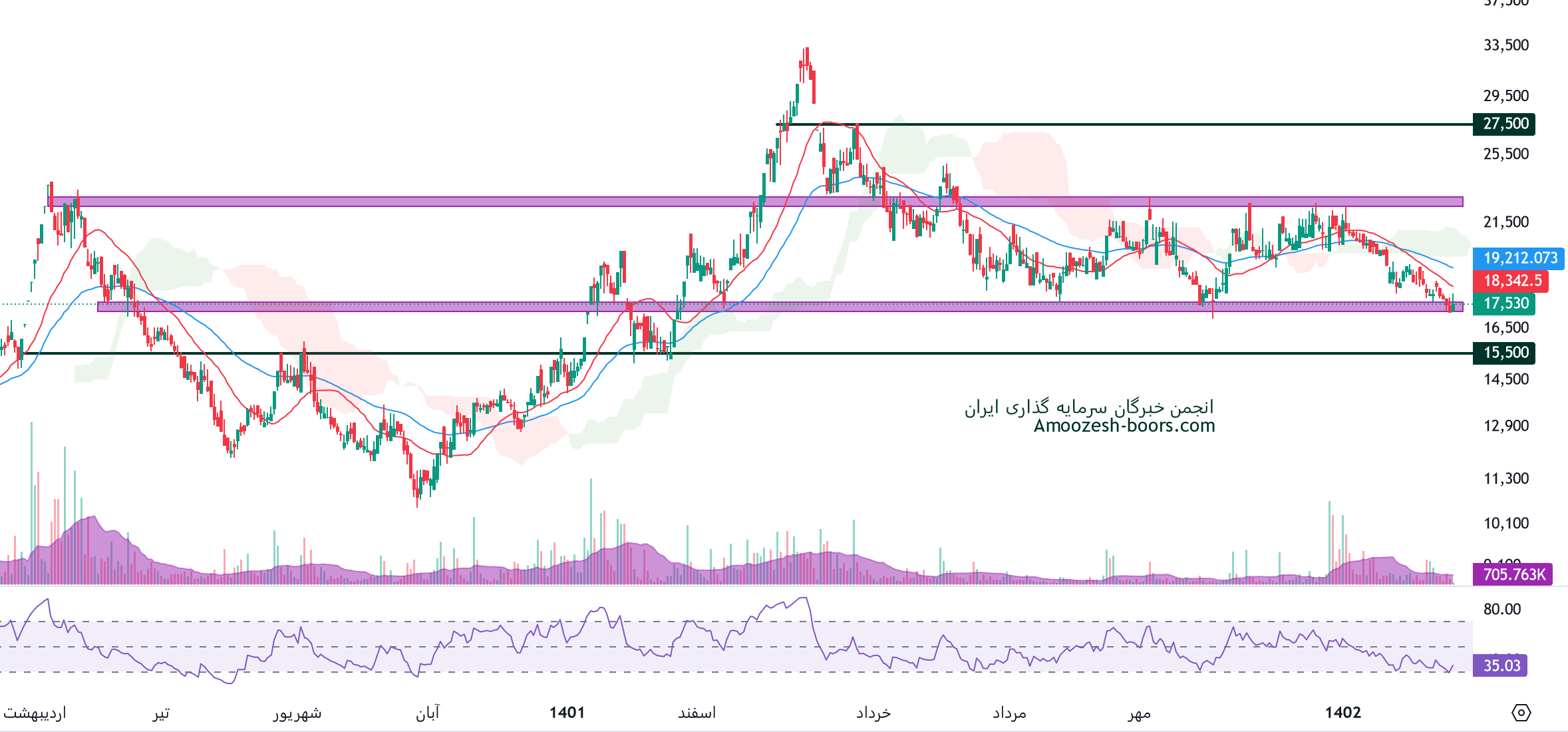 حمایت نماد شوینده از ناحیه پر تراکم 17500 ریال تشکیل شده و در صورت شکست این سطح تا حمایت بعدی سهم شوینده ( 15500ریال ) 10% فاصله وجود دارد.