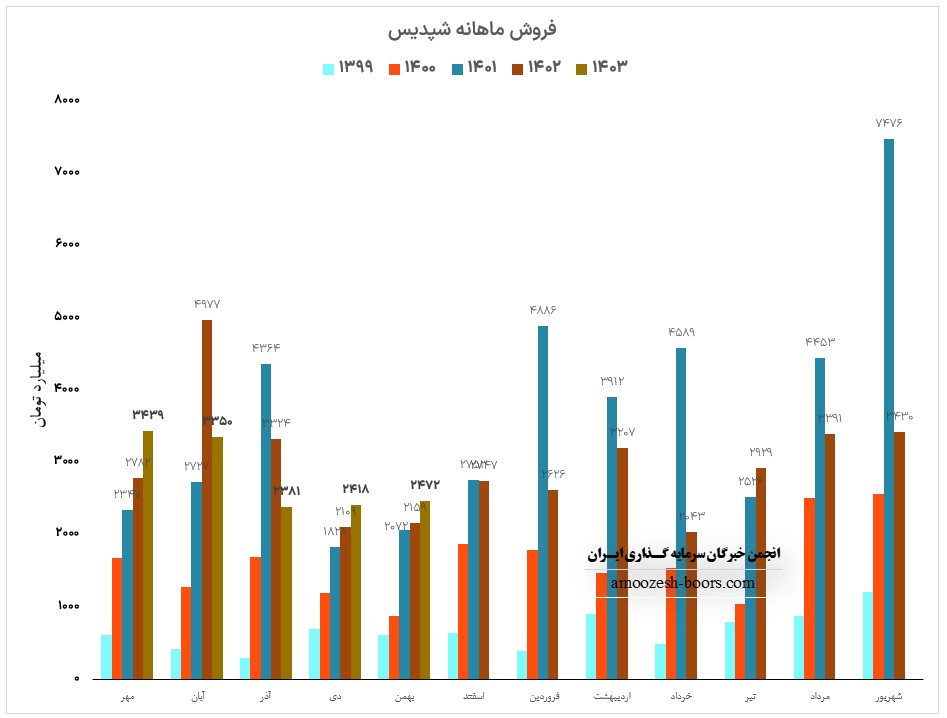 فروش آذر ماه سال 1402 سهم شپدیس 2380.8 میلیارد تومان گزارش شده است که از این درآمد 55% آن از محل فروش داخلی و مابقی از طریق فروش صادراتی تامین گردیده است، تغییرات درآمدی شپدیس به شرح زیر میباشد:
