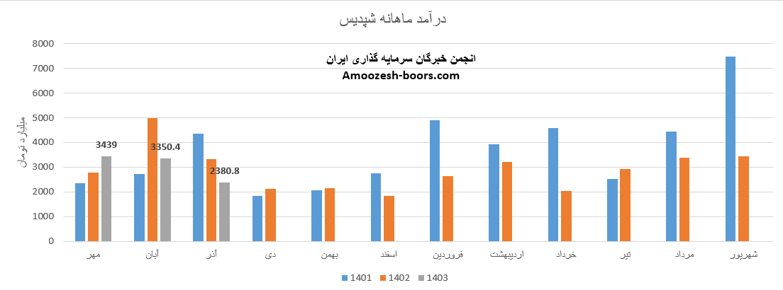 درآمد ماهانه نماد شپدیس نسبت به ماه گذشته 2% رشد، نسبت به متوسط ماهانه 21% افت و نسبت به مدت مشابه 15% رشد را تجربه نموده است.