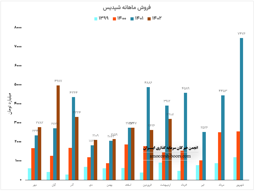 شپدیس با انجام 78% صادرات به درآمد 2626.3 میلیارد تومان دست یافت، فروش نماد شپدیس همچنان نسبت به ماه گذشته 4%، نسبت به متوسط ماهانه 13% و نسبت به مدت مشابه 46% کمتر گزارش گردیده است، سال مالی شپدیس نسبت به همگروهیان متفاوت بوده و در هفتمین ماه از سال مالی 47% از درآمد سال قبل را محقق نموده، اوره صادراتی ( گرانول فله ) نسبت به ماه گذشته افزایش دو برابری نسبت به ماه گذشته داشته اما میزان فروش اوره کشاورزی داخلی این شرکت به میزان 50% کاهش پیدا کرده، سهم شپدیس بازار صادراتی خود را تقویت نموده.