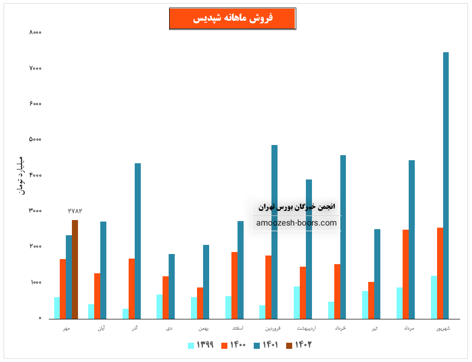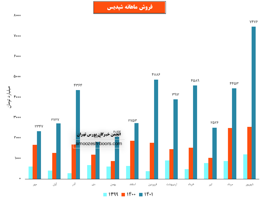 نماد شپدیس در تیر ماه فروش جالبی نداشته و در گزارش خود رقم 25.258 میلیارد ریالی را ثبت کرده است. که نسبت به دوره 1 ماهه مشابه سال قبل 143% افزایش داشته است.شرکت نسبت به میانگین ماههای گذشته خود نیز افت 58.4 درصدی در فروش خود داشته است.دلیل اصلی آن کاهش جدی فروش صادراتی شرکت پتروشیمی پردیس در حدود 69 درصدی میباشد.