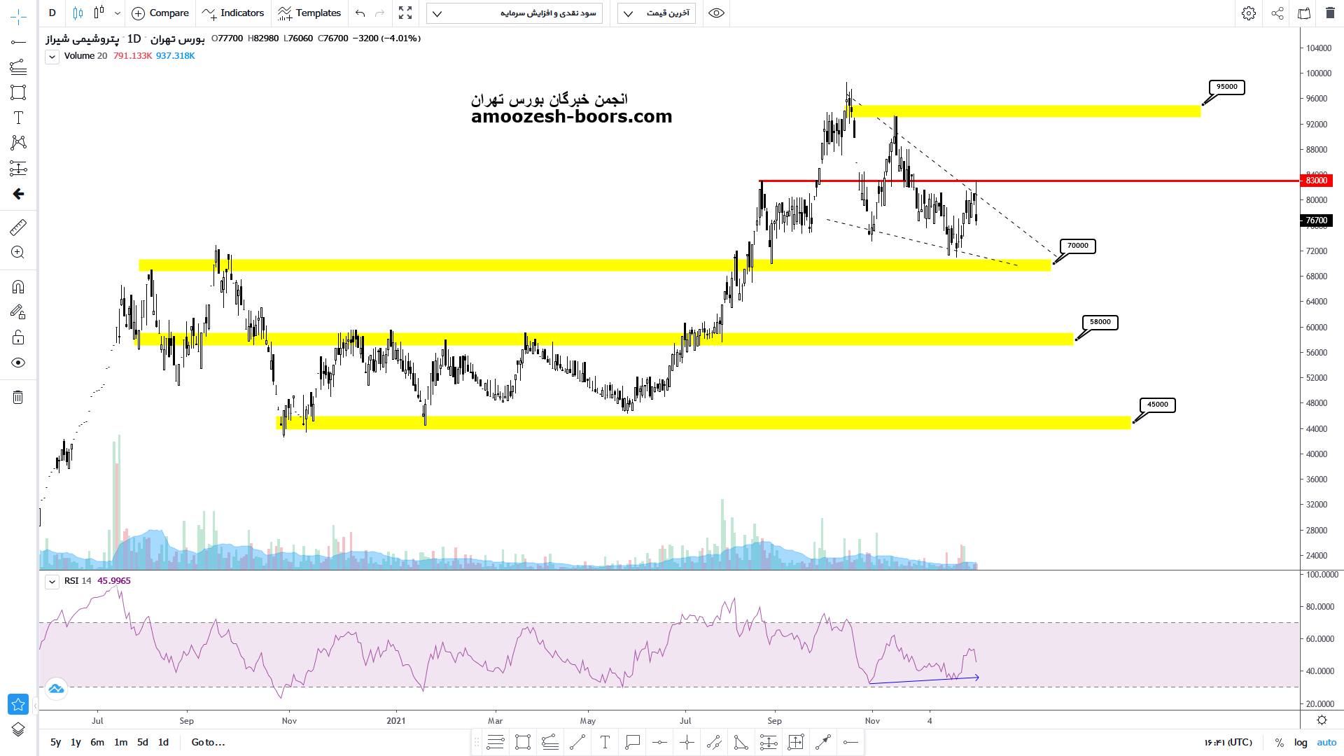 اما درصورت حمایت و شکست سقف الگو میتواند تا مقاومت های محدوده 8300 و در صورت شکست مقاومت محدوده 9500 نیز صعود کند