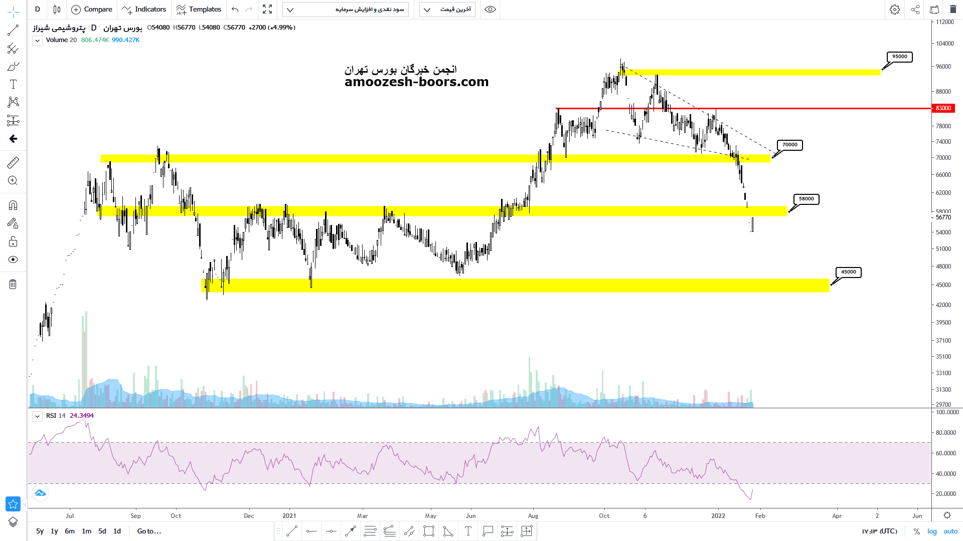 قیمت نماد شیراز درحال اصلاح درون یک الگوی اصلاحی در حال نزول میباشد و یک محدوه حمایتی مهم که هم کف الگوی اصلاحی و هم محدوده حمایتی کلاسیکی معتبر محسوب میشود را پیش روی خود خواهد دید(محدوده 7000 تومان)