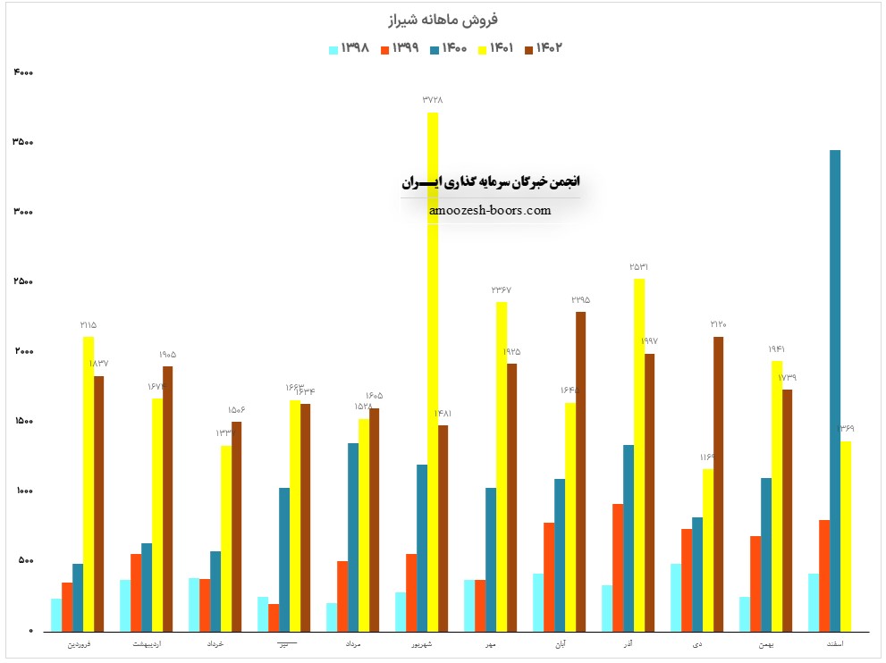 فروش سهم شیراز در این ماه افزایش 41% در مقایسه با ماه گذشته داشته است، همچنین در مقایسه به مدت مشابه 80% و نسبت به متوسط ماهانه 35% افزایش داشته است.