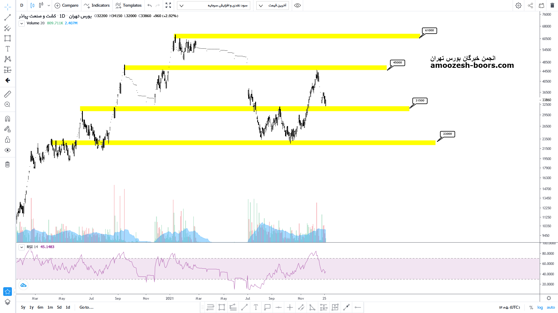 درصورت حمایت در این محدوده حمایتی قیمت میتواند تا مقاومت 4500 و سپس در صورت شکست آن تا محدوده مقاومتی 6100 هم نیز میتواند صعود کند اما در صورت عدم حمایت در این محدوده و شکست حمایت قیمت میتواند تا محدوده حمایتی 2300 نیز نزول خود را ادامه دهد.