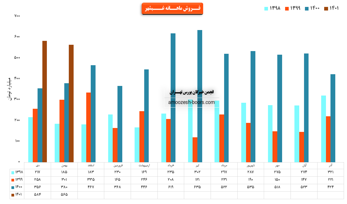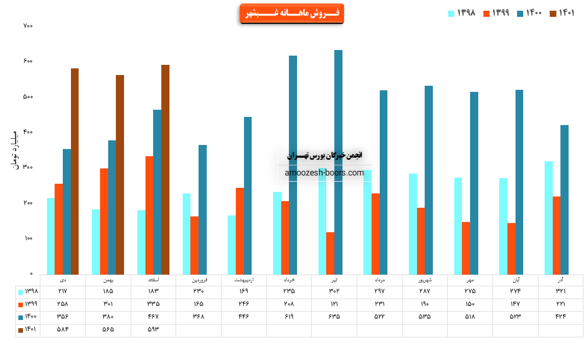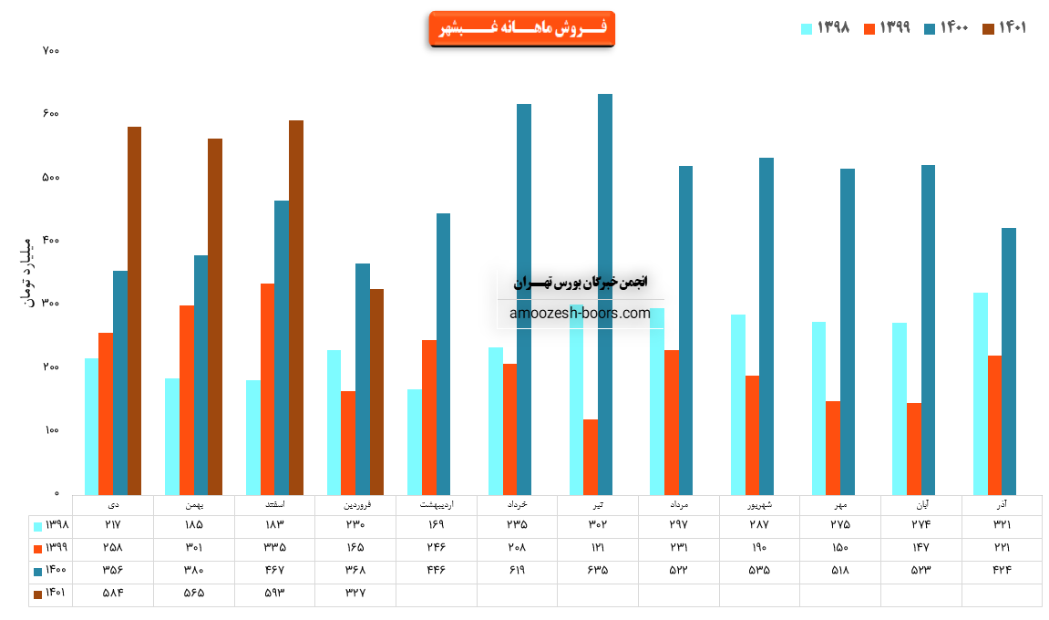 نماد غبشهر در فروردین ماه حدود بیش از 20 هزار تن از محصولات خود را به فروش رسانده که این میزان در مقایسه با حجم فروش ماه گذشته خود حدود 50% کاهش پیدا کرده است.