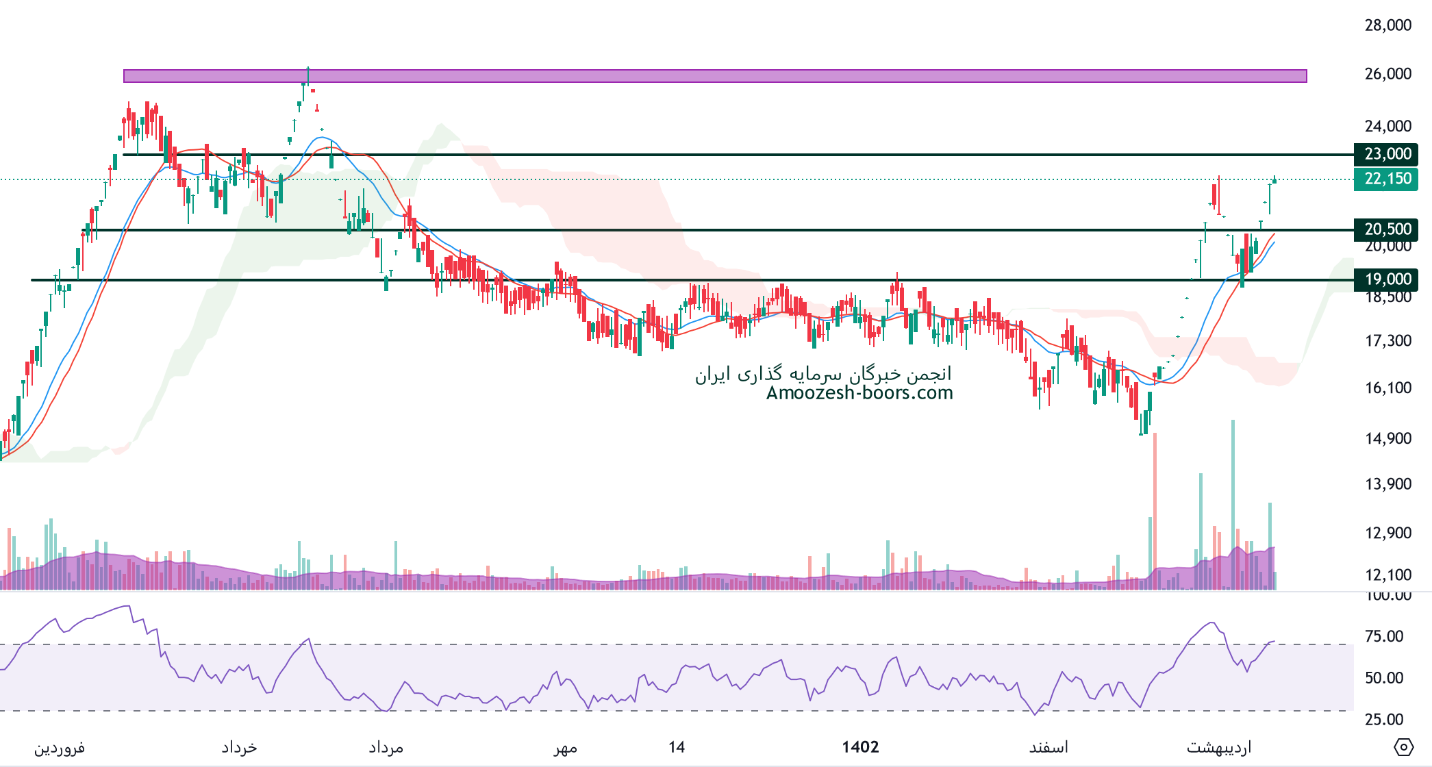 در صورت شکست مقاومت 575 و تثبیت بالای آن، میتوان انتظار ادامهی روند صعودی و رشد قیمت سهم تا مقاومت بعدی در محدودهی 700 تومان را داشت.