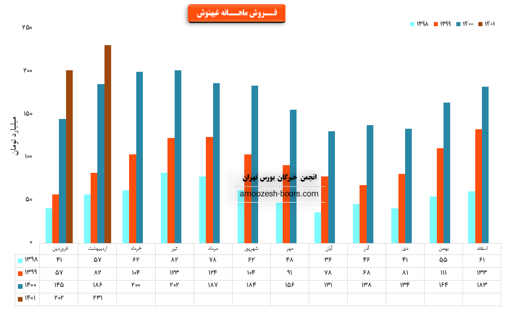 شرکت بهنوش ایران با نماد غبهنوش در دوره یک ماهه منتهی به 31 تیر ماه 1401، مبلغ 287.6 میلیارد تومان درآمد داشته است و تقریبا تمام را داخلی فروخته است.
