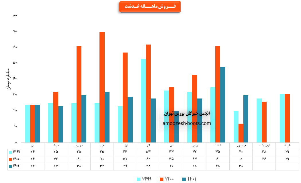 سهم غدشت در فروردین ماه حدود 780 تن از محصولات خود را به فروش رساند که این میزان در مقایسه با حجم فروش ماه گذشته حدود 46% کاهش پیدا کرده است.
