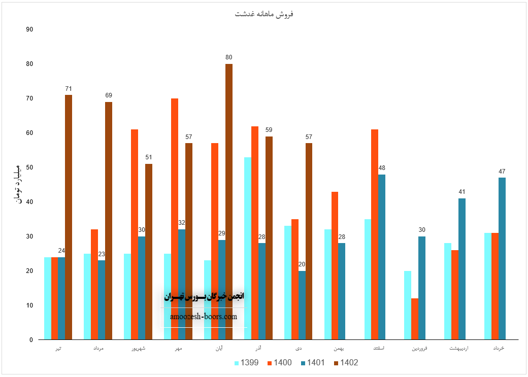 همچنین نماد غدشت با ثبت فروش 387 میلیارد تومانی در پایان 6 ماهه ابتدایی سال توانست حدود 58% از پیشبینی فروش سالانه خود را محقق سازد