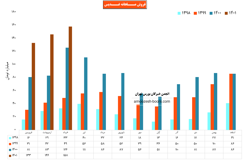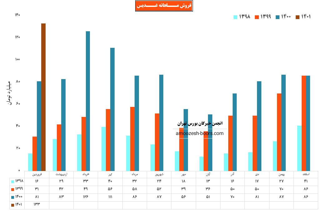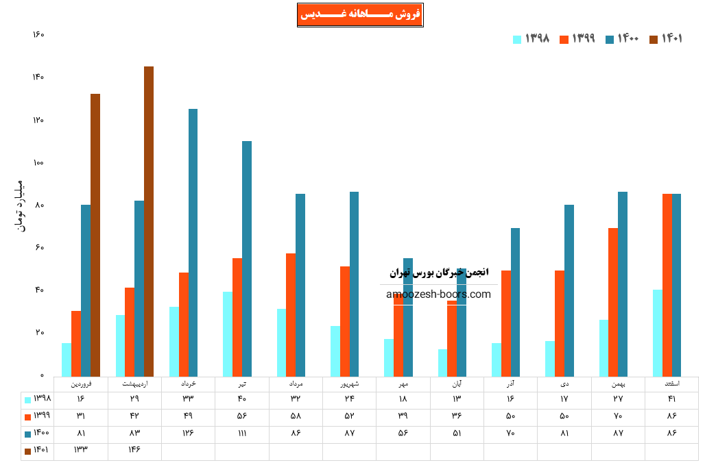 سهم غدیس در فروردین ماه حدود ۱۲ هزار لیتر از محصولات خود را به فروش رساند. این میزان نسبت به حجم فروش اسفند ماه حدود ۲۰ % افزایش پیدا کرده است. علاوه بر رشد ۲۰ درصدی حجم فروش رشد محسوس نرخ فروش محصولات این شرکت نیز دلیل اصلی افزایش ۵۵ درصدی مبلغ فروش در مقایسه با ماه گذشته بوده است.