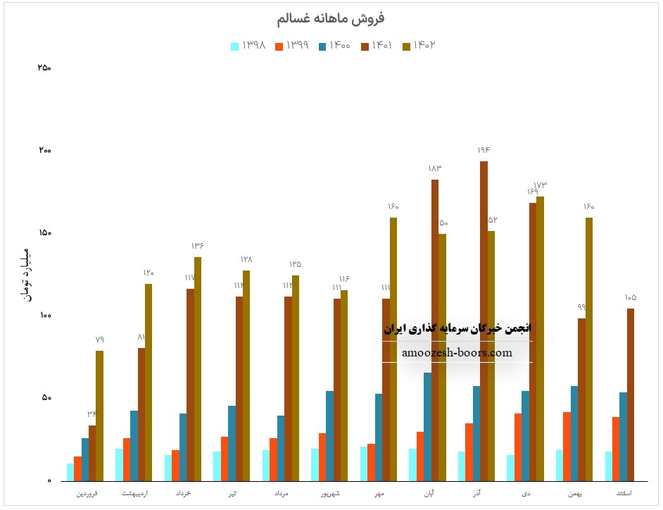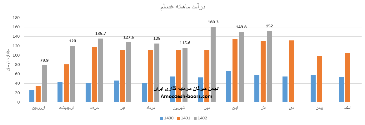 فروش آذر ماه سال 1402 سهم غسالم 152 میلیارد تومان گزارش شده است، تغییرات درآمدی غسالم به شرح زیر میباشد: