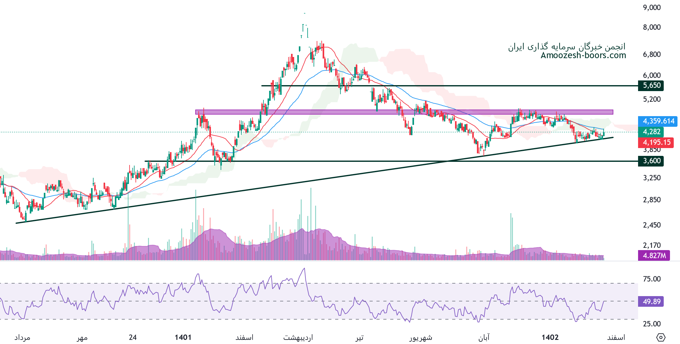 حمایت نماد غسالم از ناحیه پر تراکم 4100 ریال تشکیل شده و در صورت شکست این سطح تا حمایت بعدی سهم غسالم ( 3600 ریال ) 10% فاصله وجود دارد.