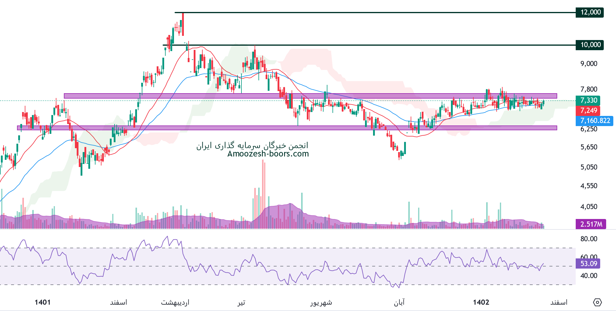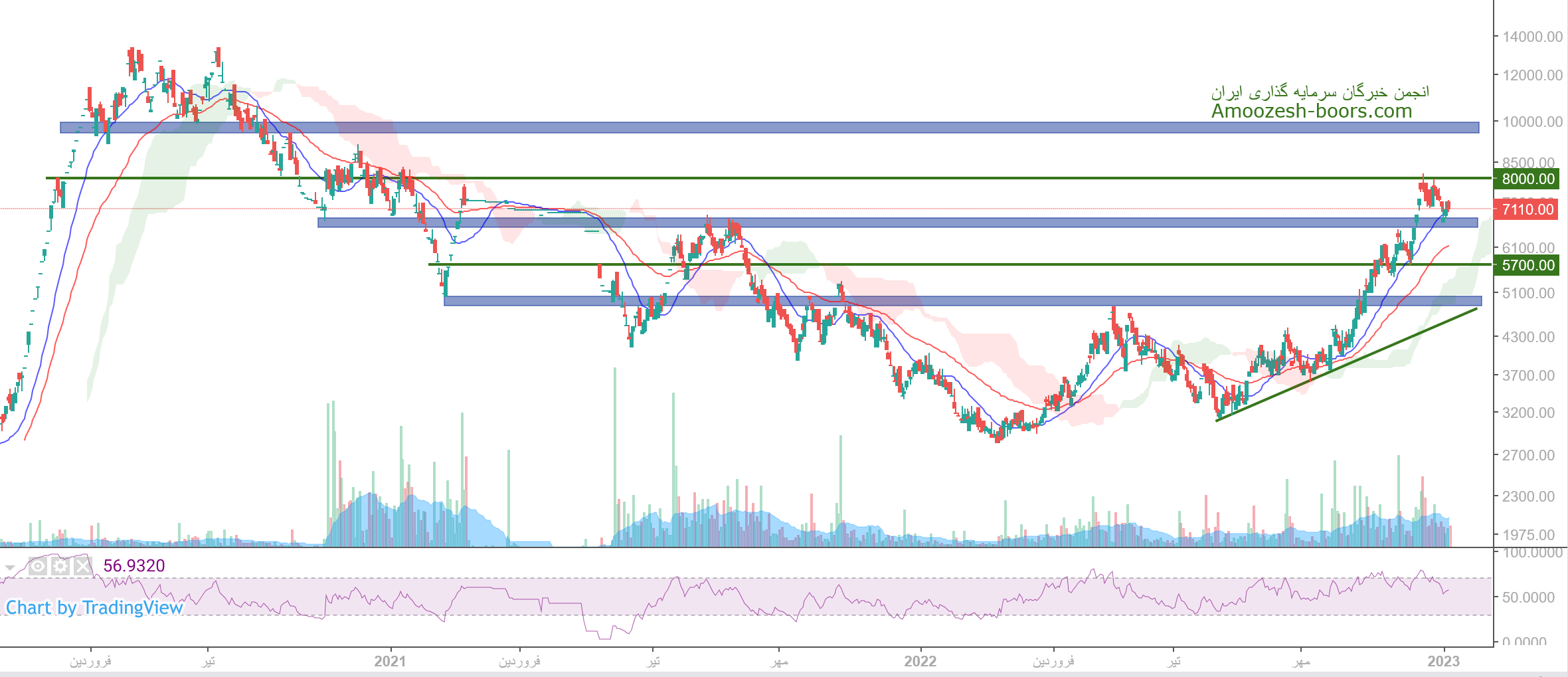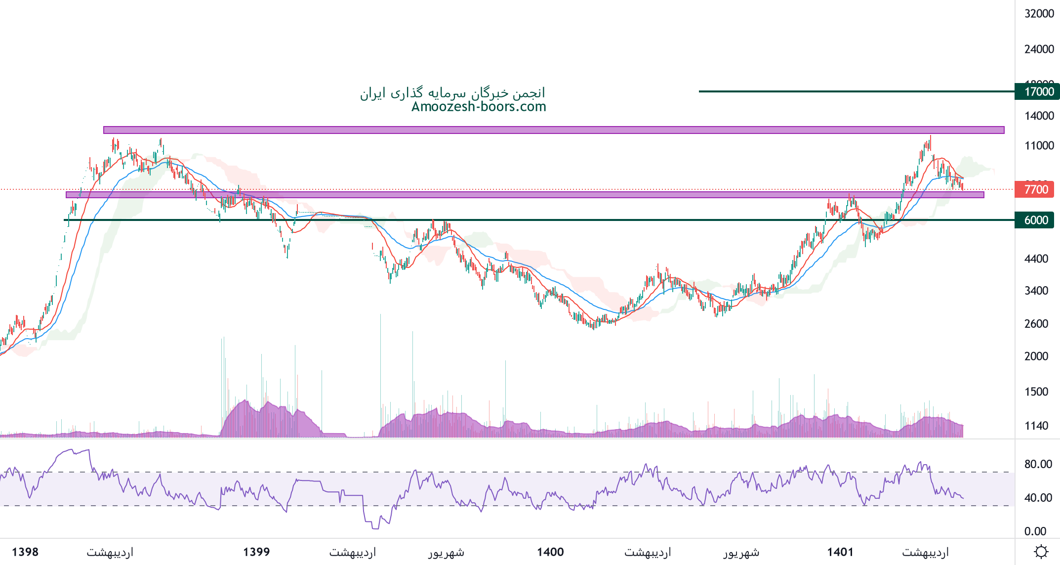 مقاومت نماد غشان از ناحیه پر تراکم 7800 ریال تشکیل شده است و با توجه به شرایط بازار شکست مقاومت و رسیدن به تارگت 12000 ریال خوش بینانه میباشد.
