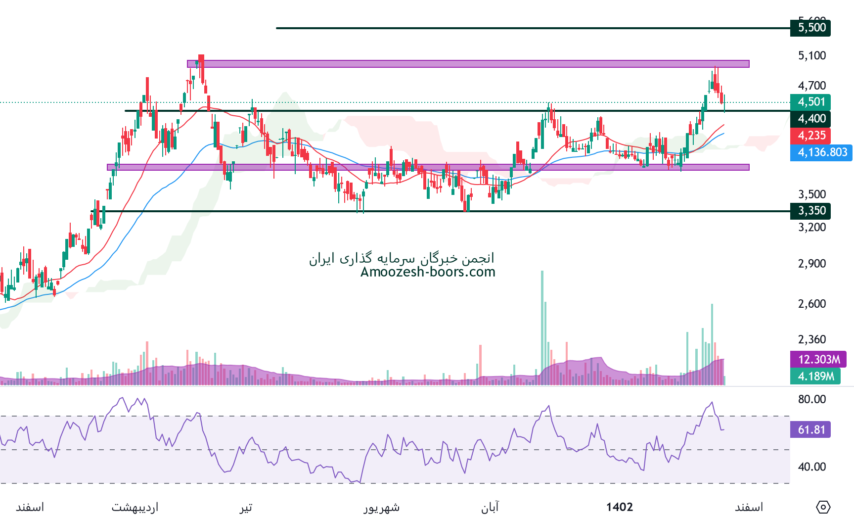 همانطور که در تحلیل تکنیکال غشهد میبینیم قیمت در محدوده حمایتی 4400 ریال و محدوده مقاومتی 5000 ریال در حال نوسان میباشد.
