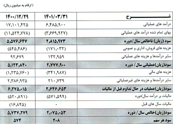 خلاصه سود و زیان شرکت برای دوره مالی سه ماهه نخست در مقایسه با سال قبل به شرح زیر می باشد :
