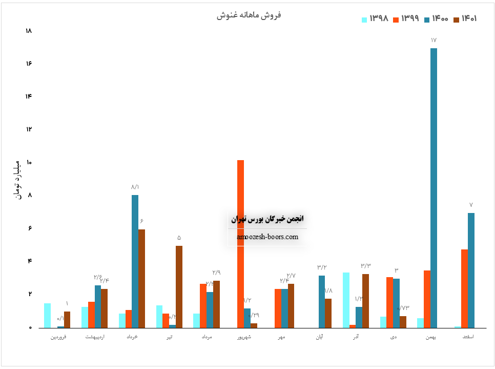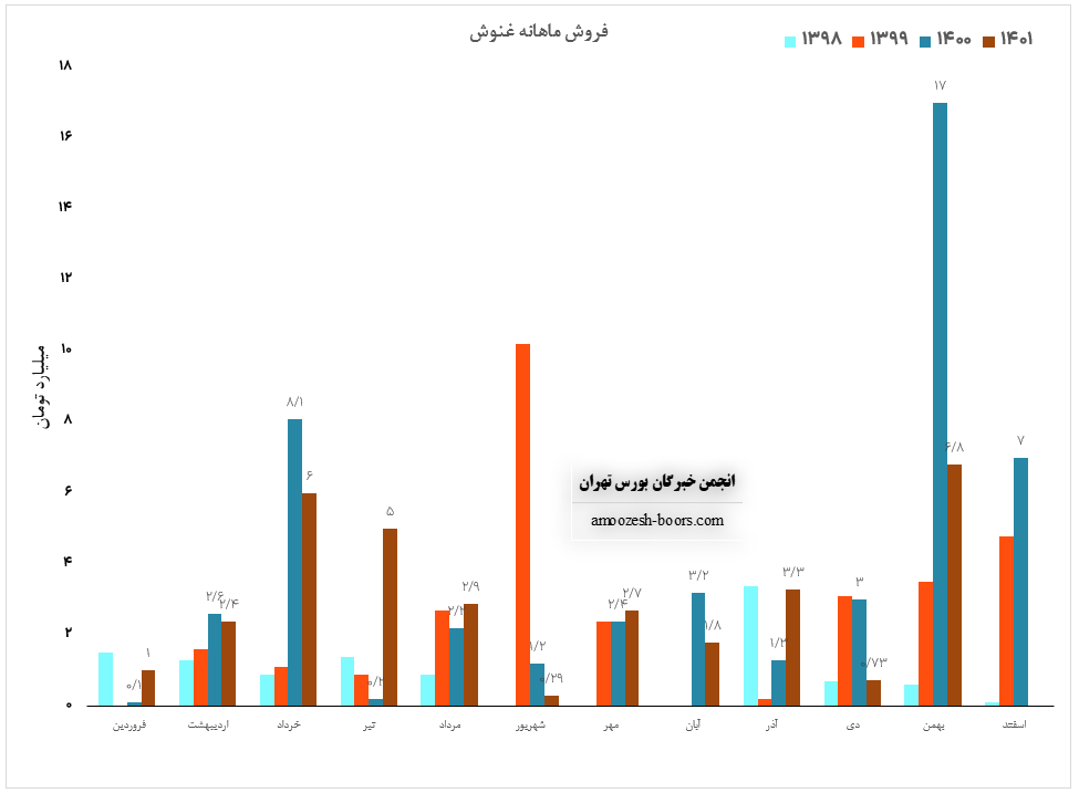 نماد غنوش در دی ماه حدود بیش از 1/250/000 کیلوگرم از محصولات خود را به فروش رسانده که این میزان در مقایسه با حجم فروش ماه گذشته خود حدود 50% افزایش پیدا کرده است. این افزایش ناشی از رشد حجم فوش تفاله مرکبات بوده است.