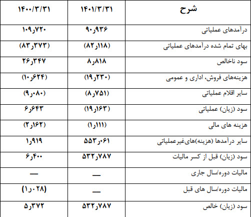 زیان عملیاتی: 300 میلیون تومان که در دوره مشابه سال گذشته 8 میلیارد تومان سود عملیاتی شناسایی شده بود.