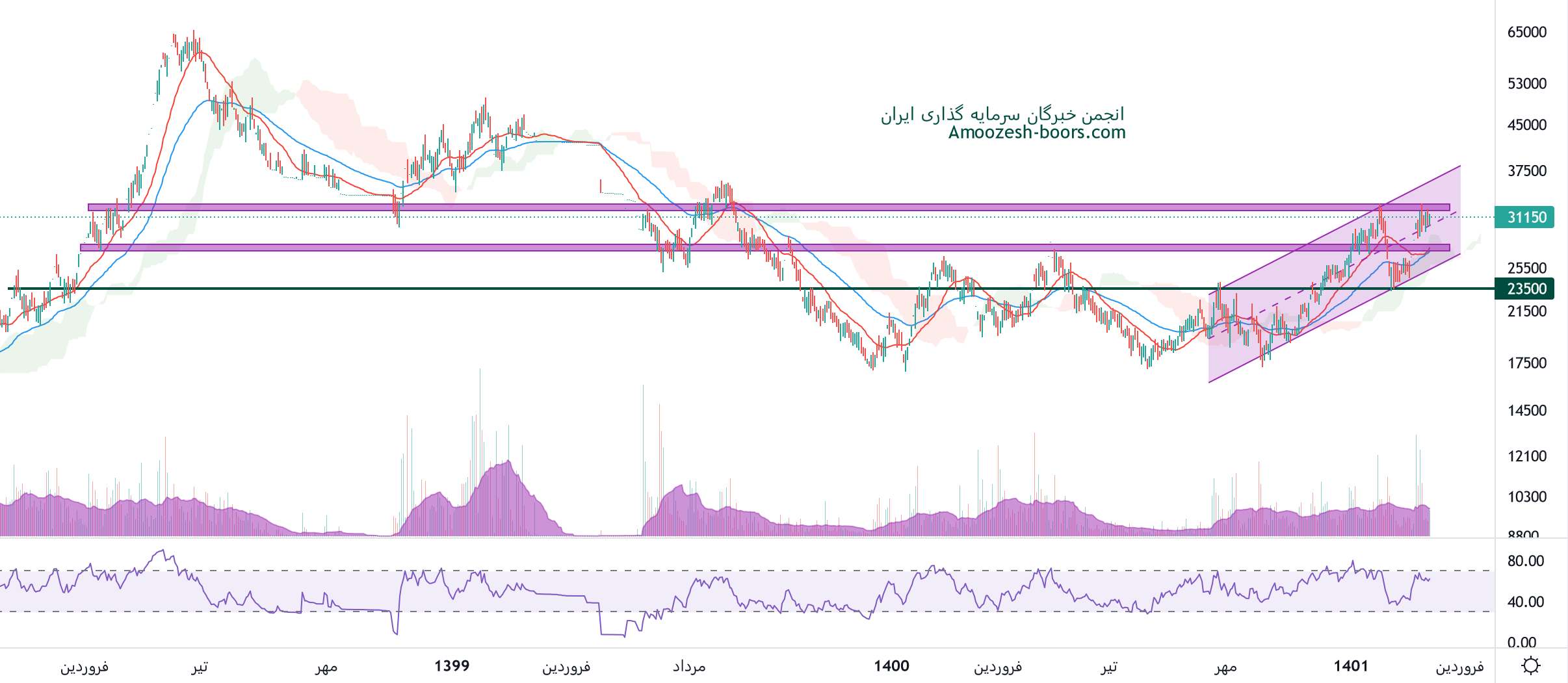 نماد غپآذر که در کانال صعودی قرار دارد در حال حاضر محدوده مقاومتی 33000 ریال را پیش رو دارد، در صورتی که سهم غپآذر موفق به شکست این محدوده مقاومتی گردد، حرکت قیمت تا 37000 ریال محتمل خواهد بود، همچنین در صورت ورود سهم به فاز اصلاحی، اولین حمایت سهم 27000 ریال خواهد بود.