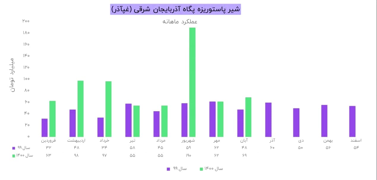 همچنین در بررسی حجم فروش انواع شیر پاستوریزه کمترین میزان فروش در آذر ماه های 5 سال اخیر را شاهد هستیم علاوه بر این غپآذر نتوانست بیشتر از 2002 تن از انواع شیر پاستوریزه خود را بفروش برساند و این میزان در مقایسه با فروش ماه گذشته با افت 15 درصدی روبرو شده است