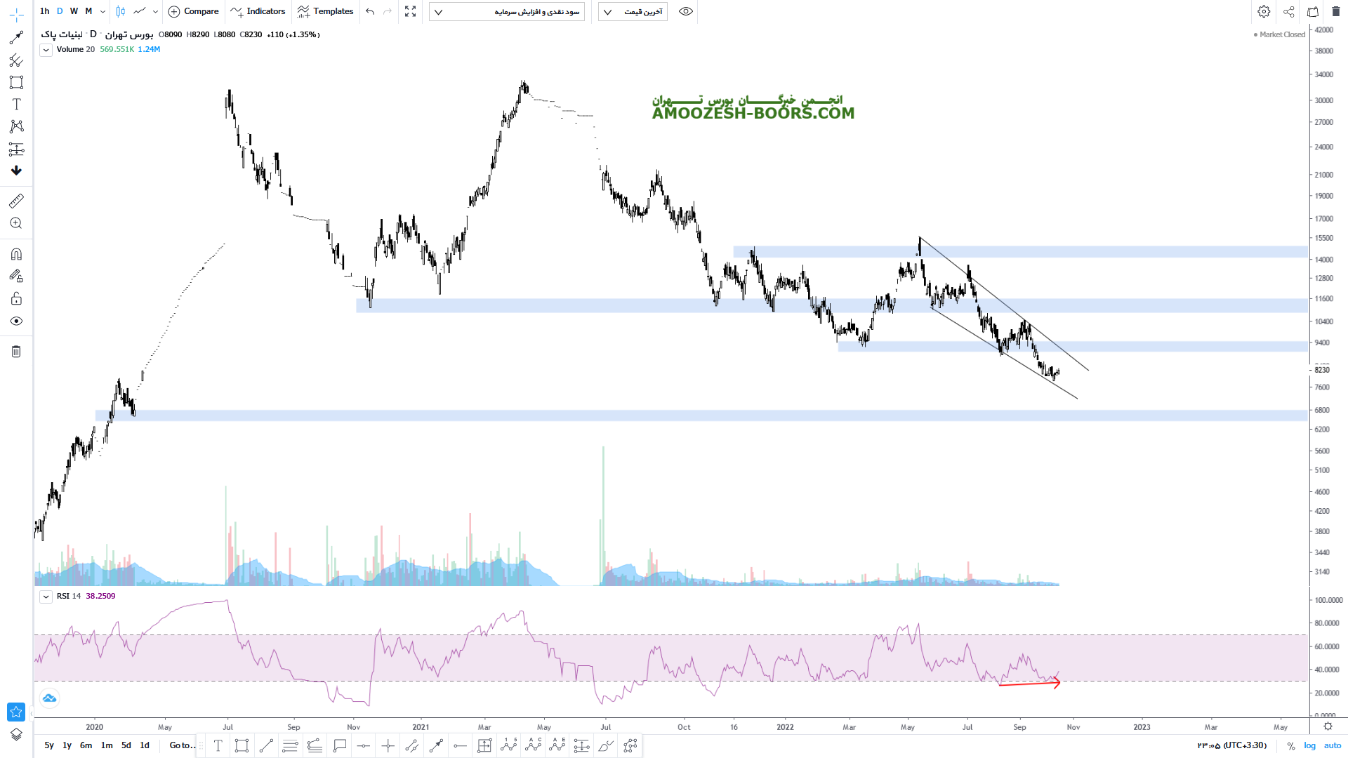 قیمت نماد پاک پس از از دست دادن کف حمایتی ناحیه ۹۲۰ تومان به نزول خود ادامه داده و اکنون با ایجاد یک واگرایی مثبت میتواند با شکست و خروج از الگو و شکست ناحیه مقاومتی ۹۲۰ تومان رشد خود را تا ناحیه مقاومتی 1100 تومان و در صورت شکست این ناحیه تا مقاومت ۱۵۰۰تومان ادامه دهد اما در صورت عدم وجود تقاضا برای رشد قیمت میتواند اصلاح خود را تا ناحیه ۶۵۰ تومان نیز ادامه دهد.