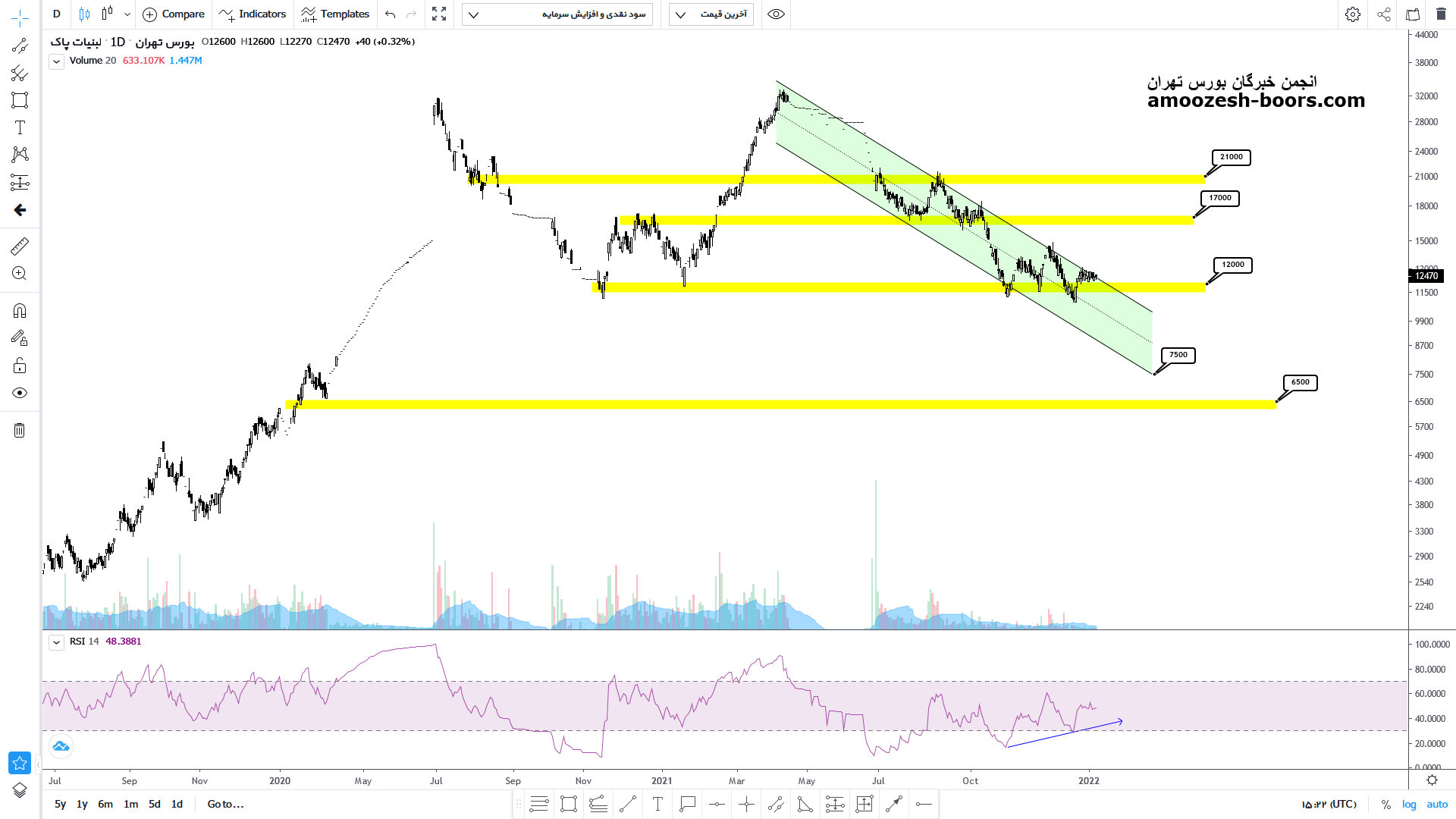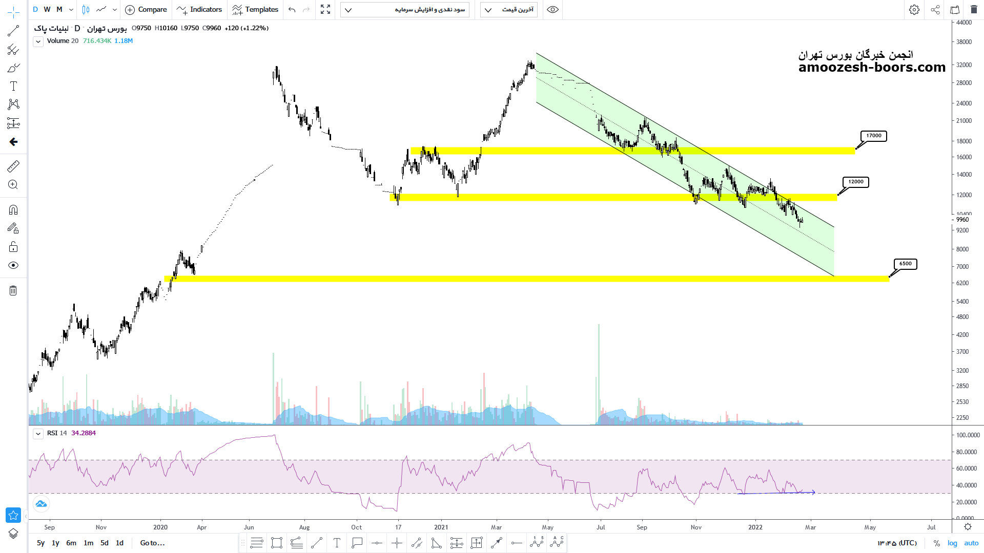 با توجه به واگرایی صعودی اندیکاور درصورتیکه قیمت بتواند سقف کانال را قطع کند میتواند تا محدوده 1700 تومان نیز صعود خود را ادامه داده و رشد 40 درصدی را تجربه کند