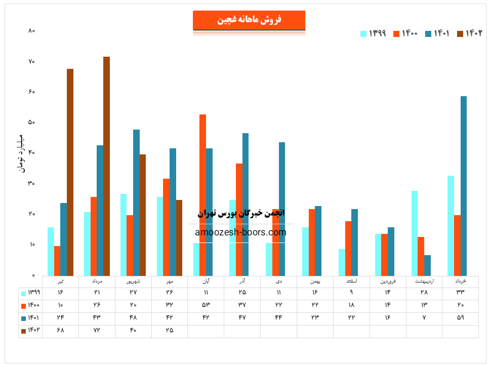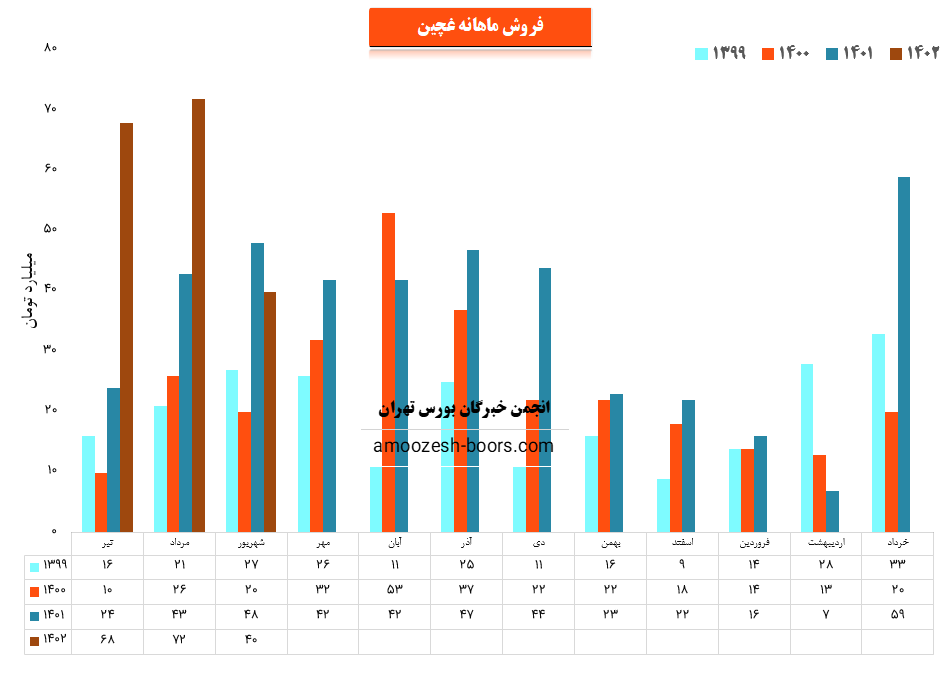 نماد غچین در شهریور ماه حدود بیش از 800 تن از محصولات خود را به فروش رسانده که این میزان در مقایسه با حجم فروش ماه گذشته خود حدود 55% کاهش پیدا کرده است.