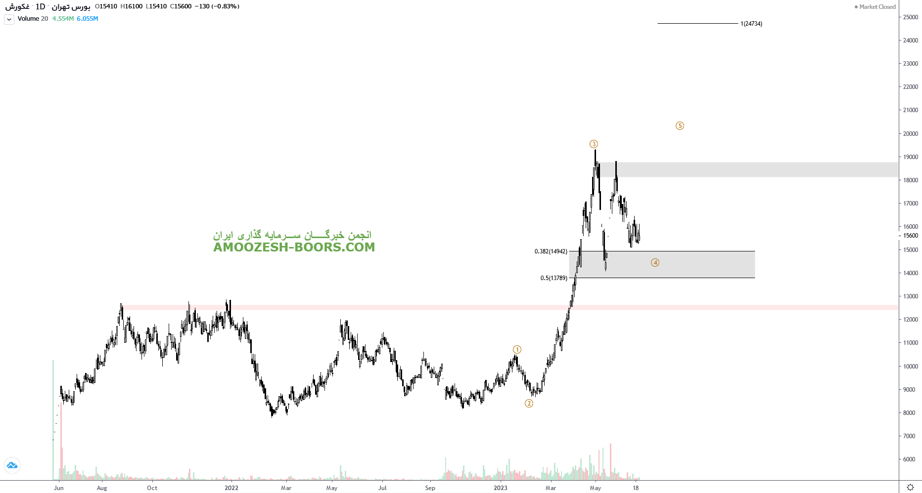 قیمت سهم غکورش پس از بروز واکنش منفی نسبت به مقاومت ناحیه 1800 تومان وارد فاز اصلاح شده و اکنون در حال تشکیل الگوی استراحت می باشد. لذا در صورت حفظ ناحیه حمایتی ۱,۵۰۰ تومان حرکت سهم تا مقاومت ناحیه 1850 تومان و سپس در صورت شکست، مقاومت بعدی سهم غکورش ناحیه ۲۵۰۰ تومان در نظر گرفته خواهد شد.