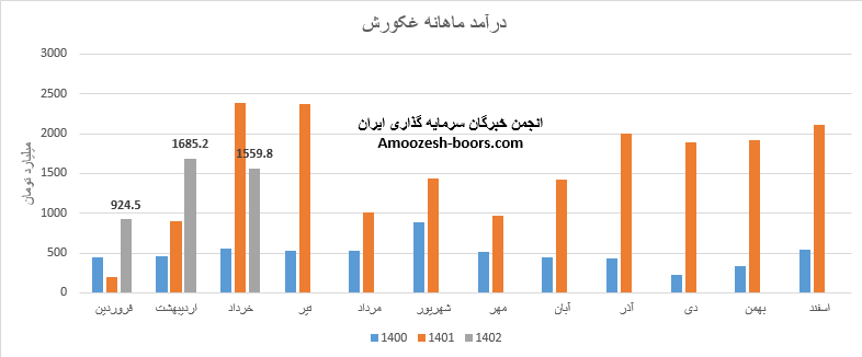 درآمد صنعت غذایی کورش ( نماد غکورش ) با افزایش 20 درصدی نسبت به متوسط ماهانه به 1559.8 میلیارد تومان رسیده است، درآمد ماهانه سهم غکورش در مقایسه با ماه گذشته و مدت مشابه به ترتیب با افت 7 و 35 درصدی همراه بوده است، روغن خوراکی به عنوان محصول اصلی غکورش گزارش شده است که افت 15 درصدی مقدار فروش نسبت به ماه گذشته داشته است، نرخ فروش این محصول بدون تغییر گزارش شده است، تحلیل بنیادی غکورش نشان میدهد که مجموع عملکرد 3 ماهه در مقایسه با مدت مشابه از افزایش 20 درصدی برخوردار بوده و طی این مدت 22% از کل درآمد سال گذشته پوشش داده شده است.