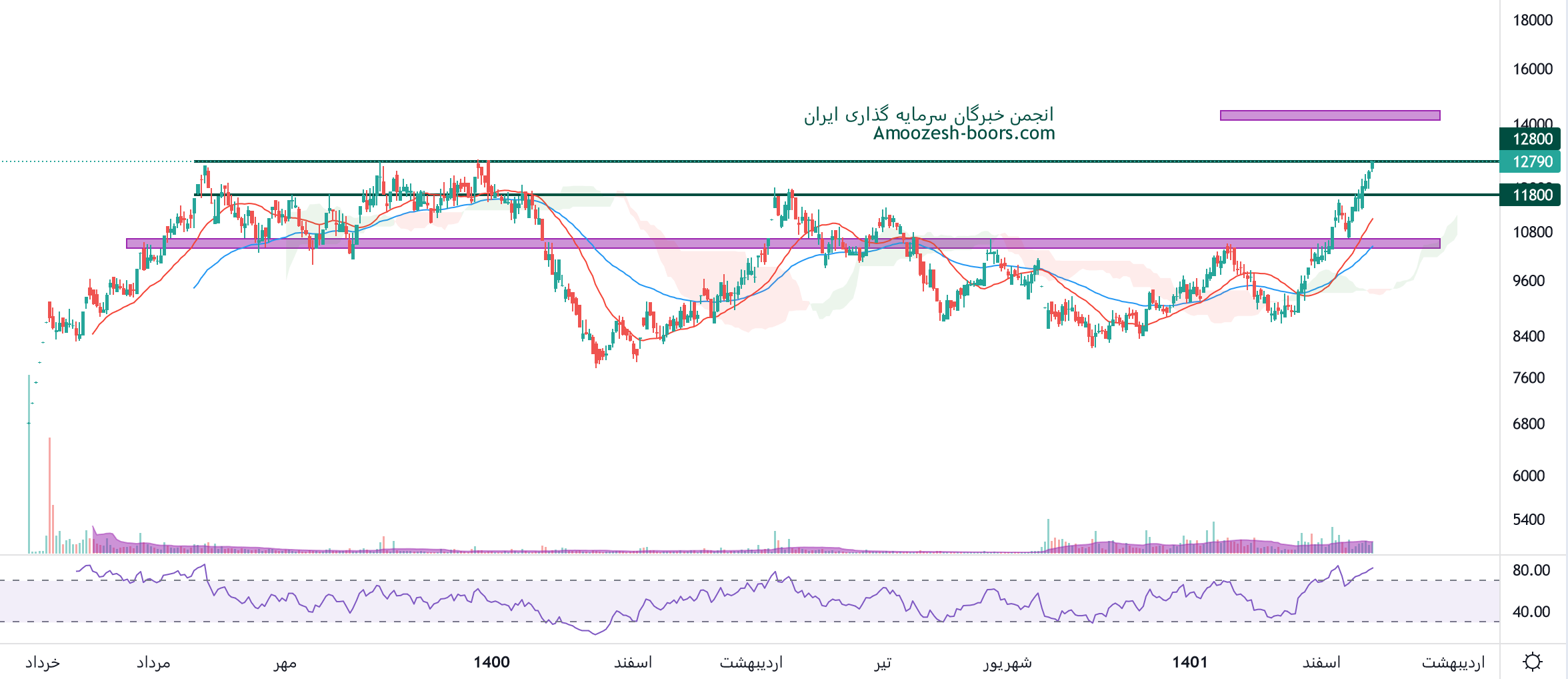 نماد غکوروش در حال حاضر درگیر محدوده پر ریسک مقاومتی 12800 ریال درسقف تاریخی خود میباشد، در صورتی که فشار خرید ادامه یابد و سهم غکوروش موفق به عبور از این سطح گردد، حرکت قیمت تا محدوده 14000 ریال محتمل خواهد بود، همچنین در صورت اصلاح، اولین حمایت سهم 11800 ریال در نظر گرفته خواهد شد.