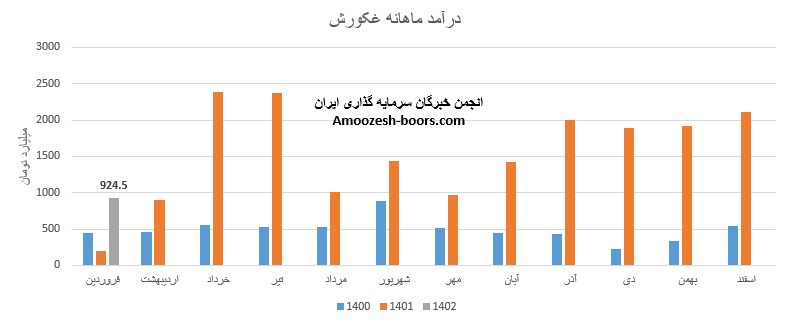 درآمد ماهانه غکورش نسبت به ماه گذشته 56% افت داشته و به 924.5 میلیارد تومان رسیده است، با توجه به اینکه این رقم در مقایسه با مدت مشابه با افزایش مطلوب 358 درصدی همراه بوده است، میتوان فروش صنعت غذایی کورش را مطلوب ارزیابی نمود، پر فروش ترین محصول نماد غکورش روغن خوراکی میباشد که با وجو افزایش 7 درصدی نرخ فروش با افت 64 درصدی مقدار و تولید، مواجه بوده است.