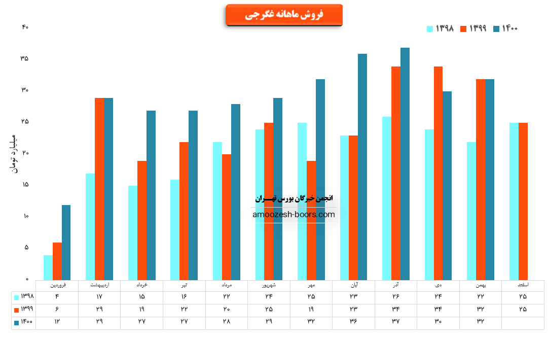 نماد غگرجی در خصوص فروش کل سال 1400 مبلغ 396  میلیارد تومان پیشبینی فروش داشته است که تا به الان و طبق آخرین گزراش ماهانه خود برای آذر ماه توانسته 65 درصد از پیشبینی خود را محقق کند و با توجه به این موضوع که تنها 3 ماه تا پایان سال مانده راه سختی را برای تحقق پیشبینی خود پیش روی خود میبیند