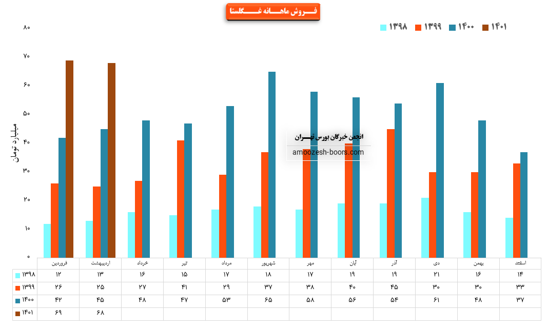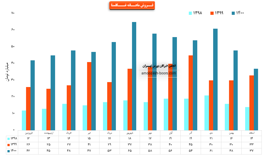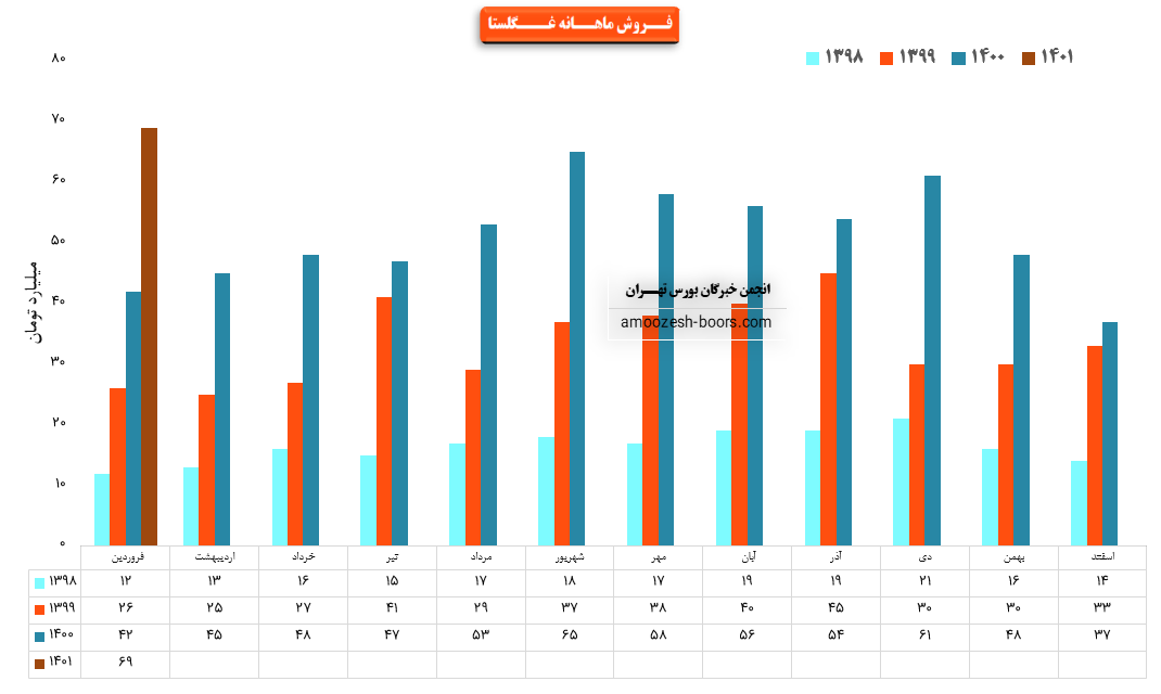 فروش نماد غگلستا: 616 میلیارد تومان که نسبت به دوره مشابه گذشته 54% افزایش یافته است.