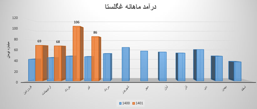نماد غگلستا در تیر ماه معادل مبلغ 86.2 میلیارد تومان درآمد داشته که نسبت به ماه قبل 19% کاهش و نسبت به میانگین ماه های قبل 6% افزایش داشته است.