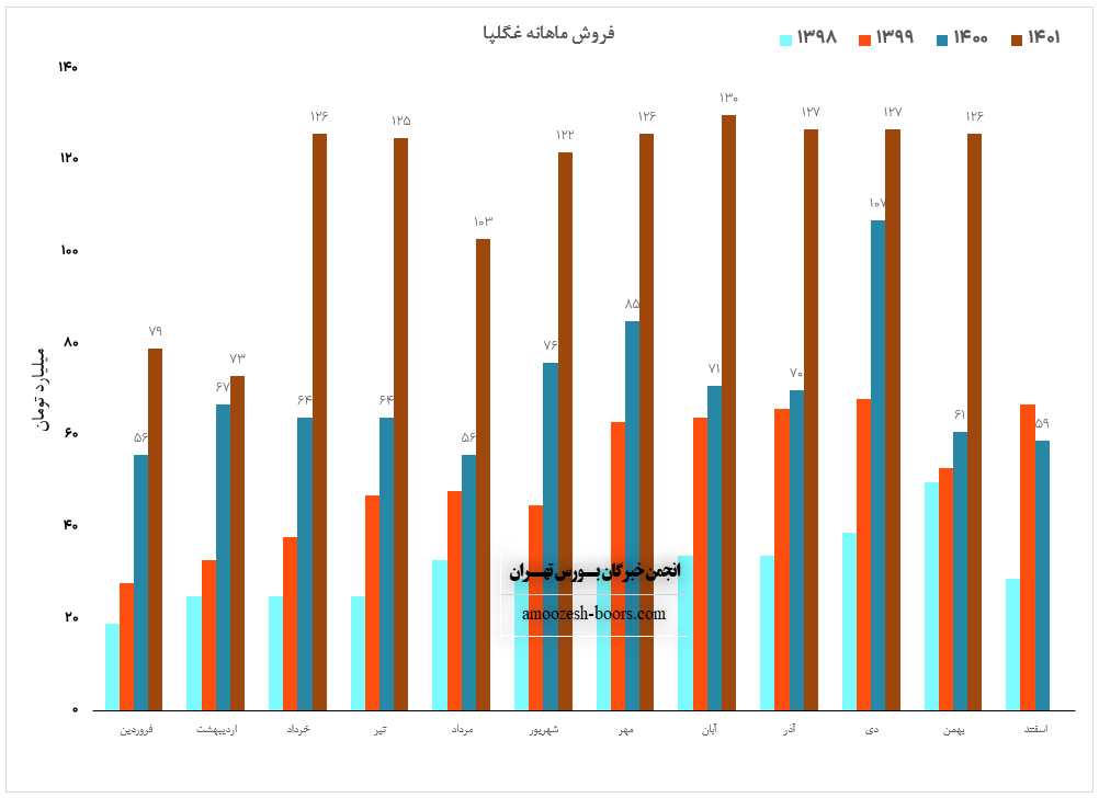 نماد غگلپا (شرکت شیر پاستوریزه پگاه گلپایگان) در بهمن ماه 1401 حدود مبلغ 126 میلیارد تومان درآمد داشته که این میزان در مقایسه با ماه گذشته 1% افت و همچنین در مقایسه با مدت مشابه سال گذشته 107% رشد پیدا کرده است.