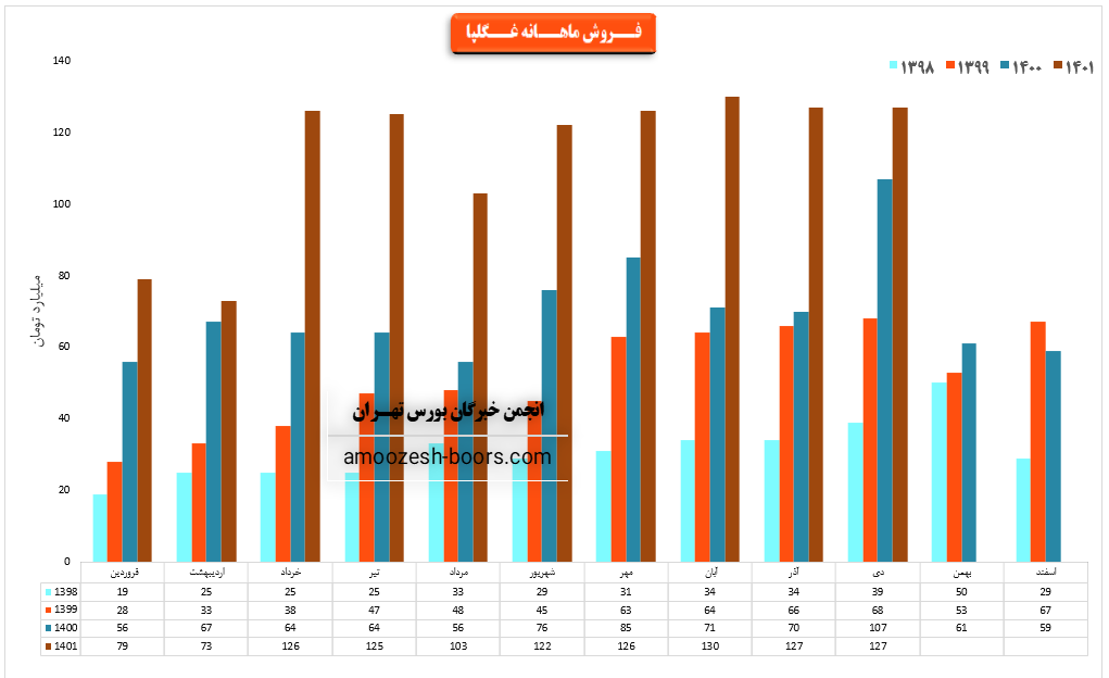شرکت شیر پاستوریزه پگاه گلپایگان (غگلپا) در گزارش مهر ماه خود مبلغ 125.5 میلیارد تومان را کسب نمود. این رقم نسبت به ماه قبل 2% افزایش ، نسبت به میانگین ماهانه 20% افزایش و نسبت به مدت مشابه سال قبل 48% افزایش داشته است . سهم غگلپا در آبان ماه تمرکز خود را بر افزایش مقدار فروش انواع کره گذاشته است و موفق شده مقدار فروش این محصول را 230 درصد نسبت به ماه قبل افزایش دهد همچنین نرخ شیر به دلیل حذف ارز ترجیحی نهاده های دامی افزایش 3% نسبت به ماه قبل را تجربه نموده است. بهمین دلیل شاهد افزایش فروش ریالی نماد غگلپا هستیم .