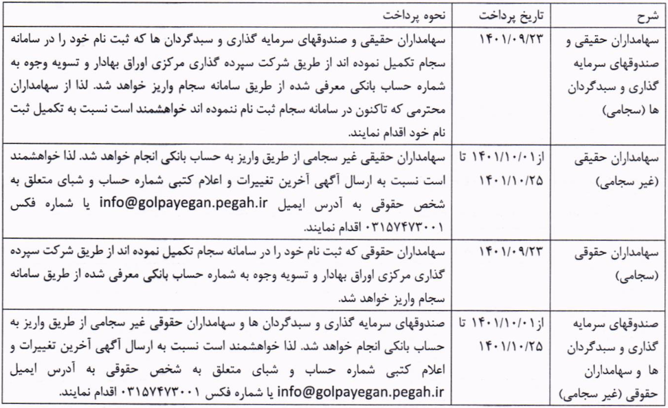 احتراما برنامه زمانبندی پرداخت سود سهام سال مالی نماد غگلپا منتهی به ۱۴۰۰/۱۲/۲۹ سهامداران محترم این شرکت، به شرح زیر میباشد: