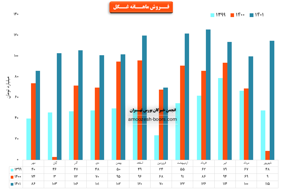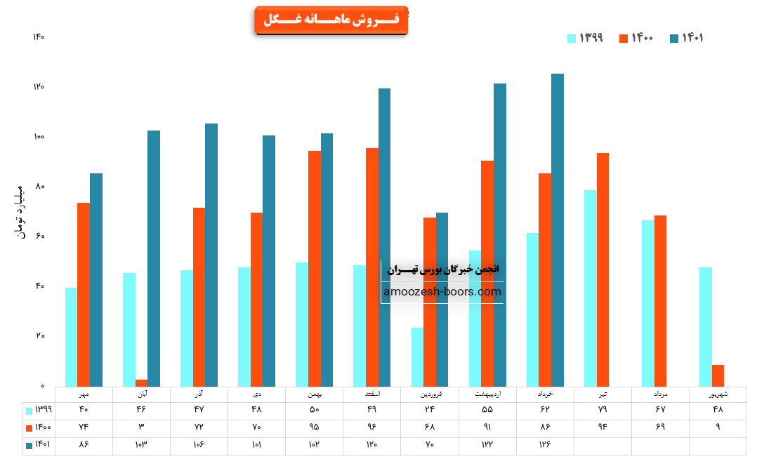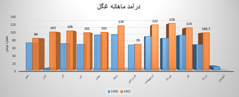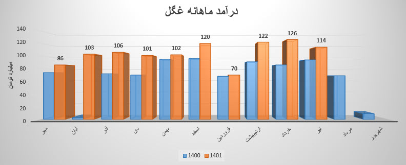 سهم غگل در دوره یک ماهه منتهی به 31 تیر ماه 1401، مبلغ 114.3 میلیارد تومان درآمد داشته که نسبت به ماه قبل 10% کاهش و نسبت به میانگین ماه های قبل 8% افزایش داشته است.