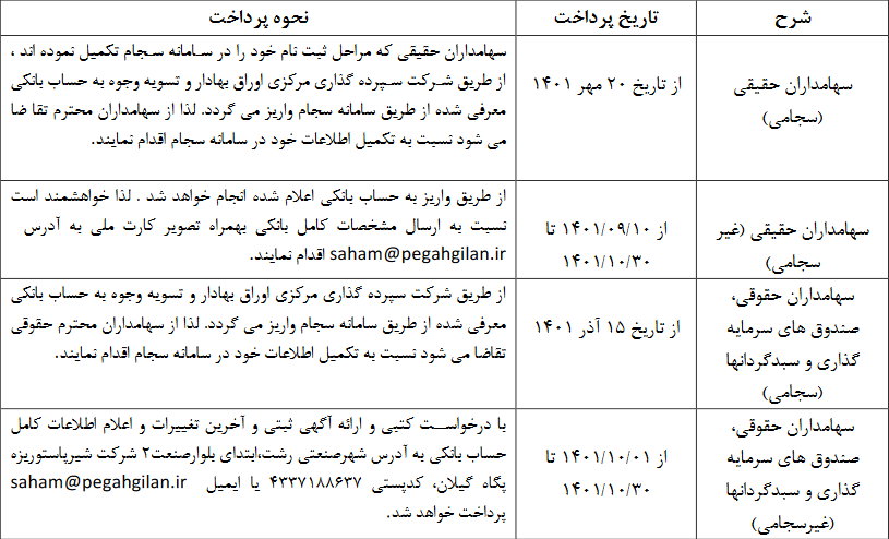احتراما، در اجرای سود تقسیمی مصوب مجمع عمومی عادی سالانه نماد غگیلا با همکاری شرکت سپرده گذاری مرکزی اوراق بهادار و تسویه وجوه (سهامی عام) از طریق سامانه جامع اطلاعات مشتریان (سجام ) بدینوسیله برنامه زمانبندی پرداخت سود نقدی سهام سال ۱۴۰۰ این شرکت به شرح ذیل اعلام می گردد: