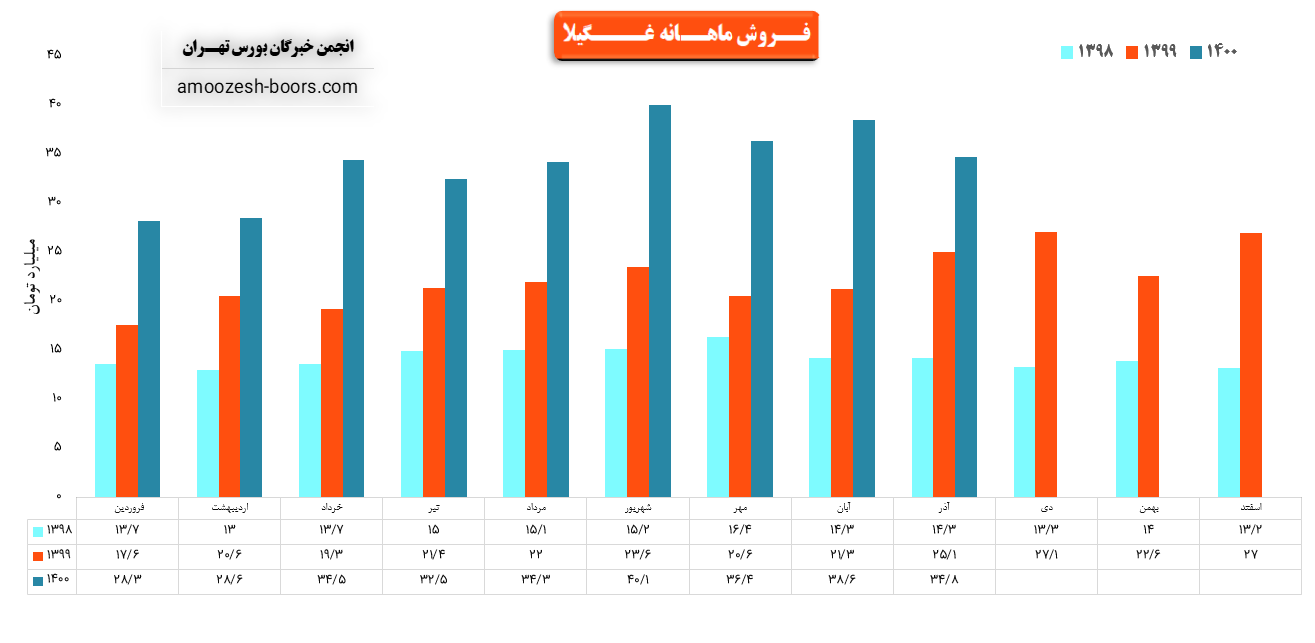 نماد غگیلا در آذر 1400 مبلغ 35 میلیارد تومان درامد داشته که این میزان نسبت به ماه گذشته 10% افت و همچنین نسبت به مدت مشابه سال گذشته 39% رشد پیدا کرده است!