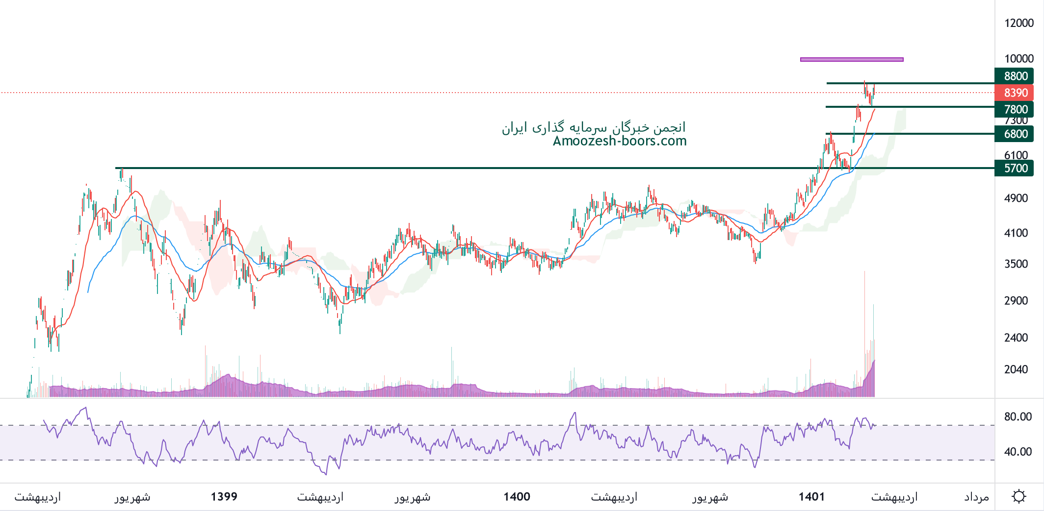 نماد فاسمین مابین محدوده حمایتی 7800 و مقاومتی 8800 ریال میباشد، دست یافتن به تارگت 10000 ریال مستلزم شکست محدوده مقاومتی میباشد، همچنین در صورت از دست رفتن سطح حمایتی، حمایت بعدی 6800 ریال در نظر گرفته خواهد شد.