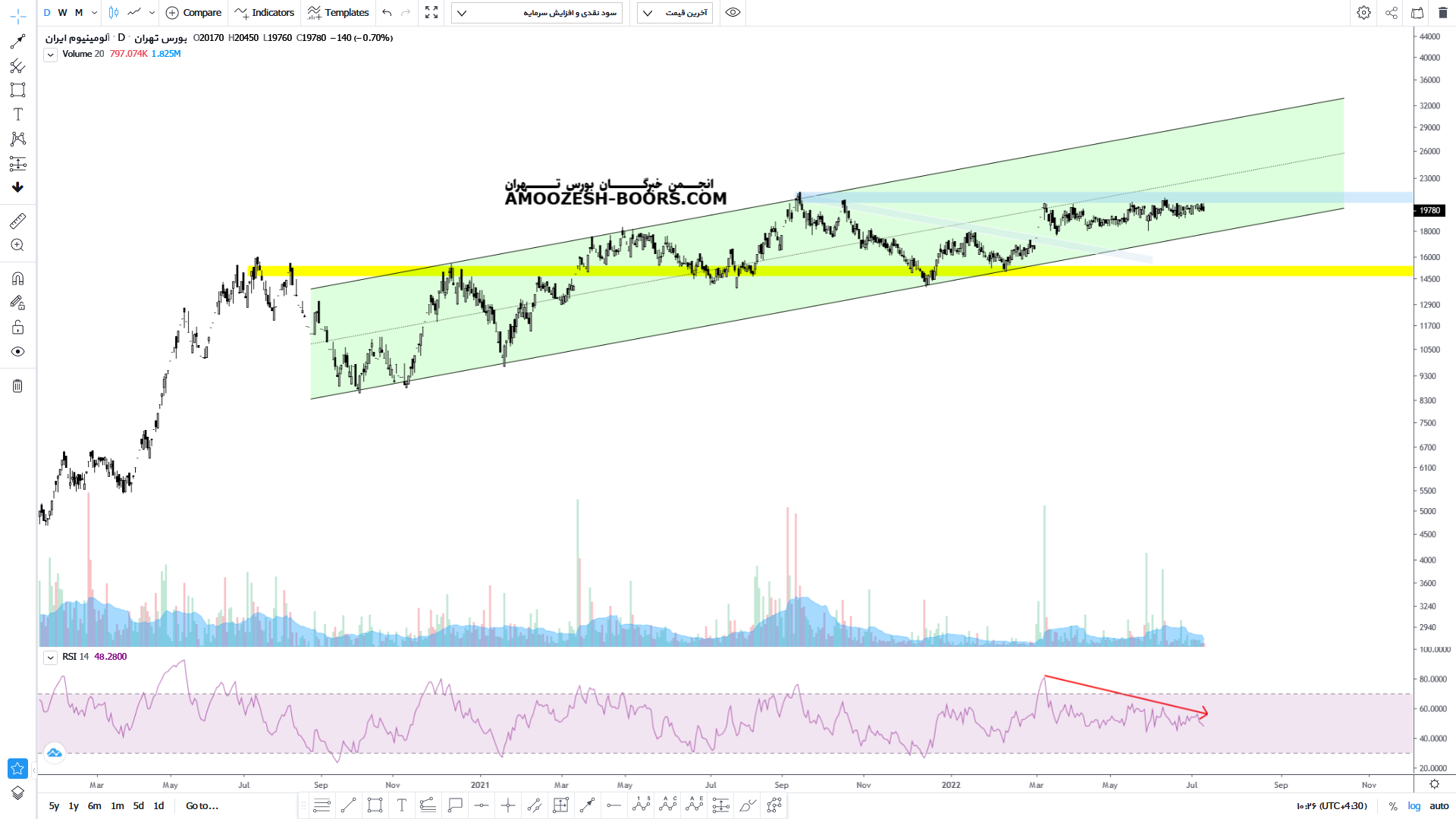 قیمت سهم فایرا با تست چند باره مقاومت مهم و تاریخی محدوده 2000 تومان این بار با ایجاد واگرایی منفی به نظر نمی آید که قدرت شکست این محدوده مقاومت قوی را داشته باشد لذا محدوده حمایتی کف کانال صعودی را پیش روی خود دارد که در صورت از دست دادن آن می تواند اصلاح خود را تا حمایت ناحیه ۱۴۰۰ تومان نیز ادامه دهد اما در صورت شکست سقف تاریخی 2000 تومان می تواند رشد خود را تا سقف کانال صعودی نیز ادامه دهد.