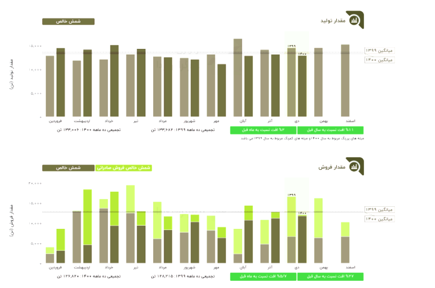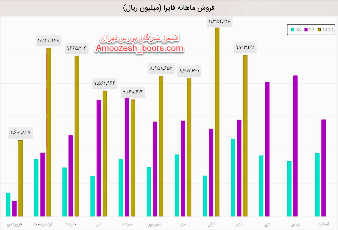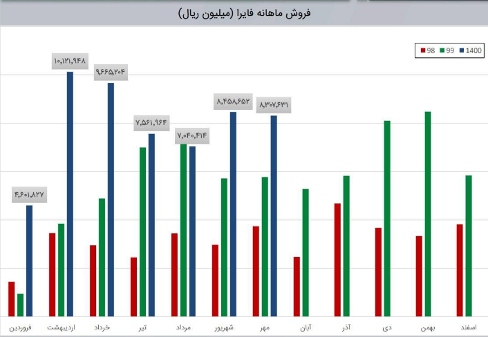 همچنین گزارش ماهانه فایرا از نظر مقداری نشان میدهد که در مهر 1400 موفق به فروش 11,422 تن محصول شده است که نسبت به ماه گذشته کاهش 13 درصدی داشته است.