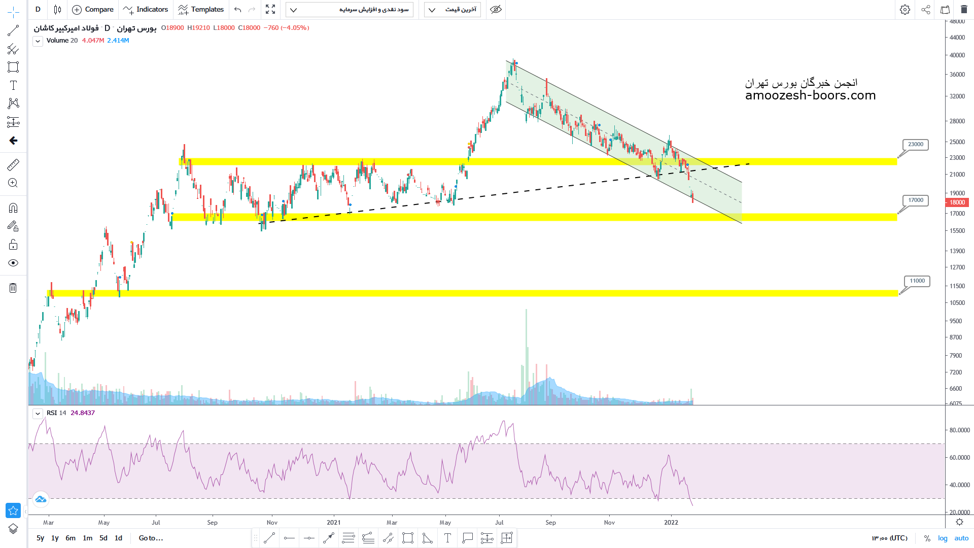 محدوده حمایتی 1700 تومان میتواند مقصد این نزول باشد که درصورت حمایت و بوجود امدن تقاضا قیمت میتواند نوسانی رو به بالا تا سقف کانال نزولی خود تجربه کند و در صورت شکست، این صعود تا محدوده مقاومتی 2300 نیز میتواند ادامه داشته باشد.
