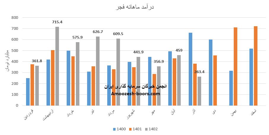 فروش آذر ماه سال 1402 سهم فجر 263.4 میلیارد تومان گزارش شده است که 85% از این درآمد از طریق فروش داخلی و مابقی از طریق فروش صادراتی به دست آمده است، تغییرات درآمدی فجر به شرح زیر میباشد: