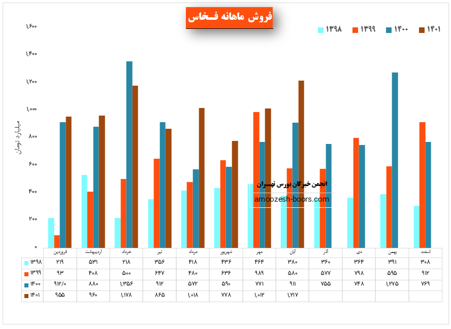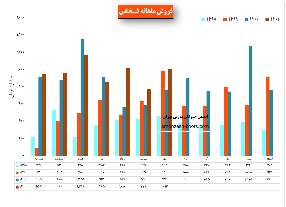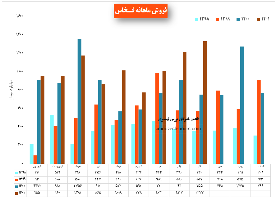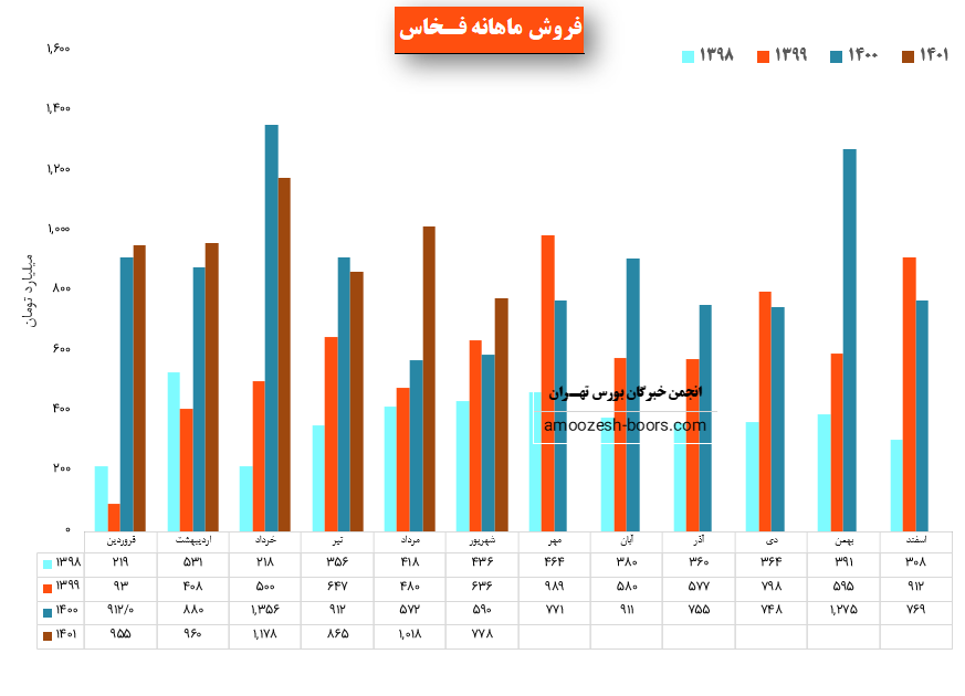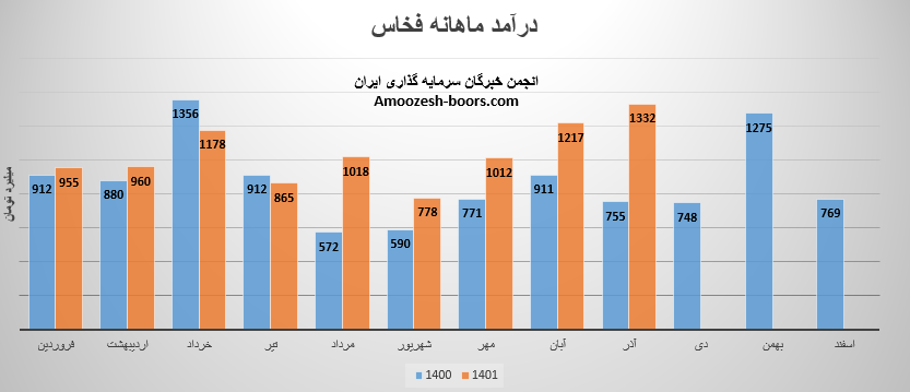 نماد فخاس (مجتمع فولاد خراسان) در آذر ماه ۱۴۰۱ حدود مبلغ 1332 میلیارد تومان درآمد داشته که این میزان در مقایسه با ماه گذشته و همچنین در مقایسه با مدت مشابه سال گذشته به ترتیب 9% و 76% افزایش درآمد پیدا کرده است.